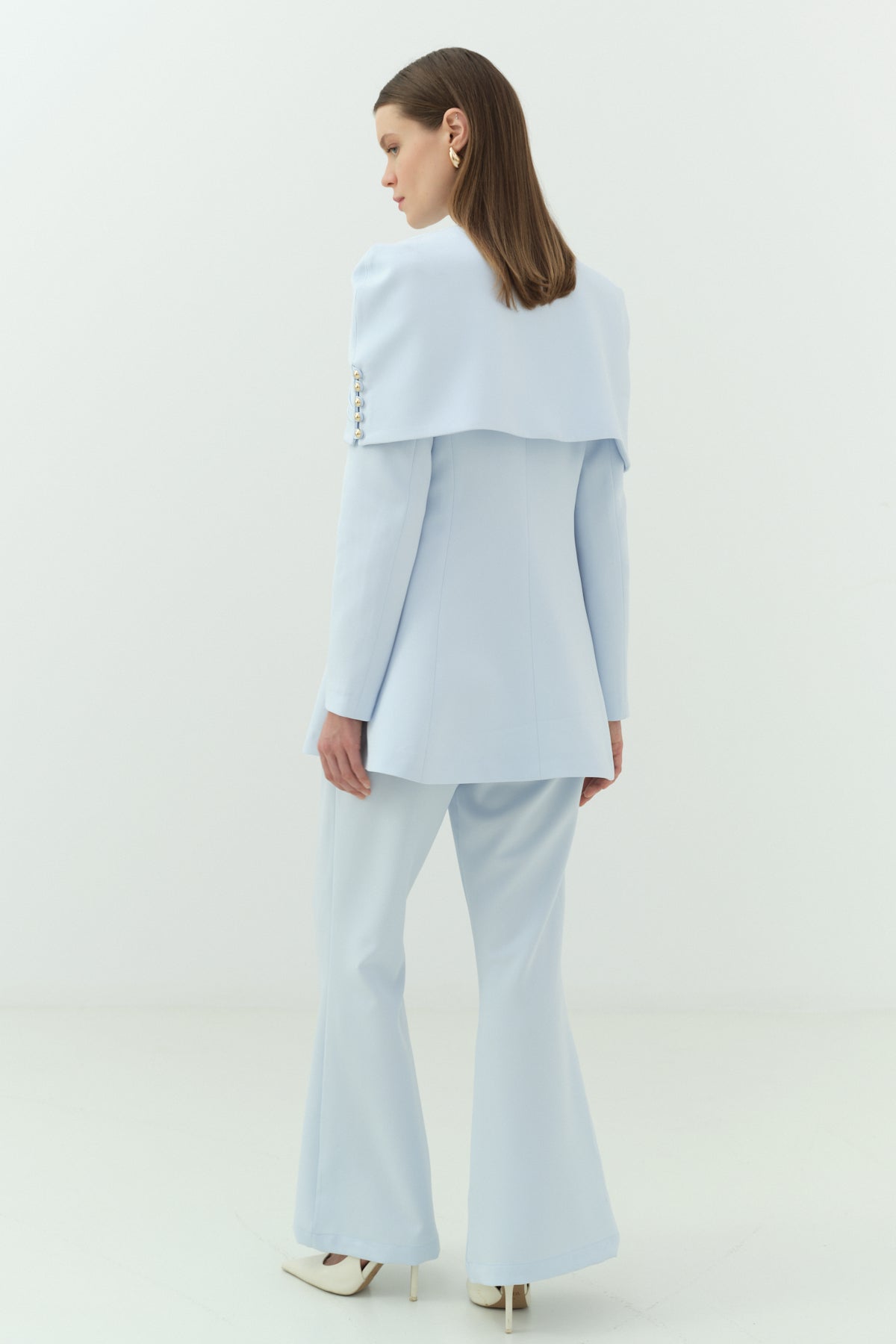 Yüksek bel, düz paça pantolonu ile hem uzun hem de dengeli bir siluet sunar. Takım olarak kullanıma uygun olduğu gibi, parçalar ayrı ayrı kombinlenerek de farklı stiller yaratılabilir.