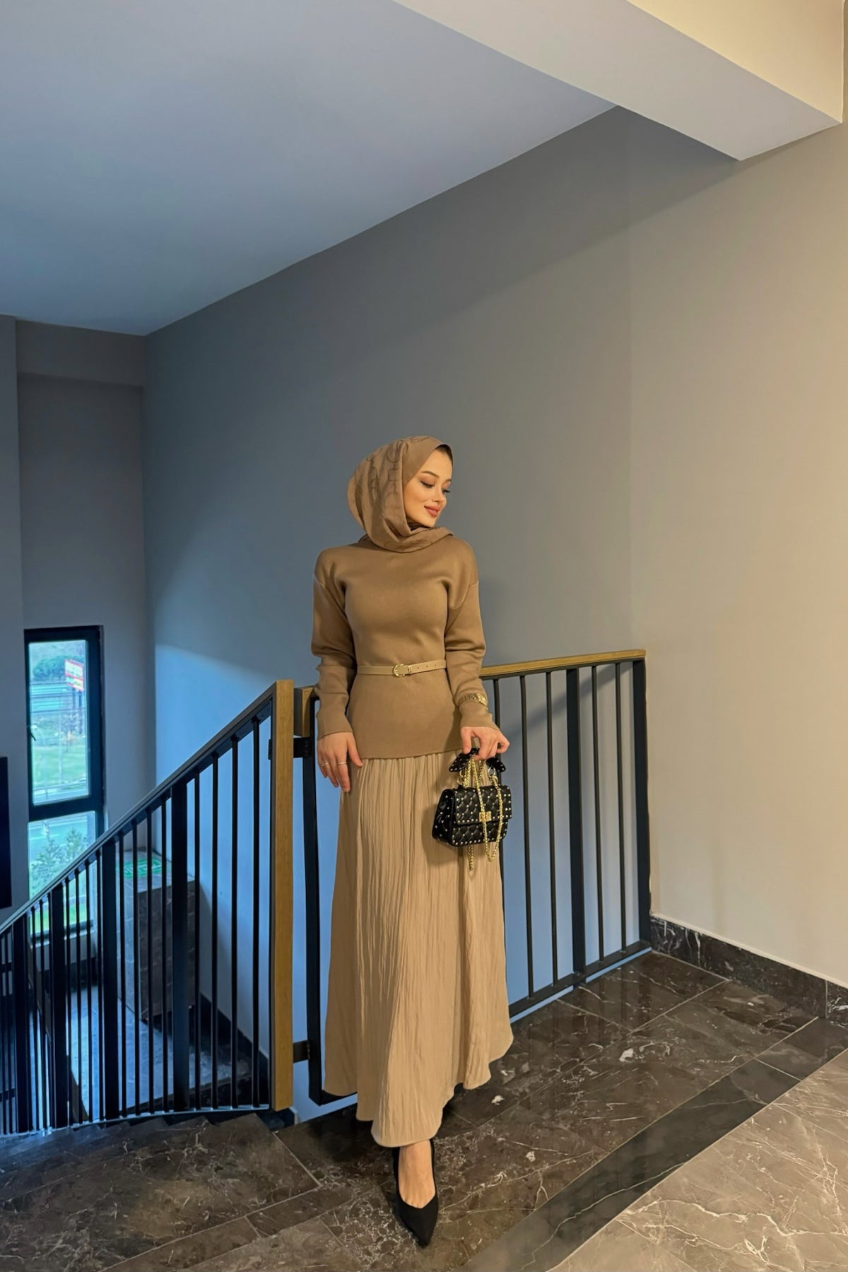 Çiçek Tokalı Bağlama Detaylı Etekli  Takım - Bej