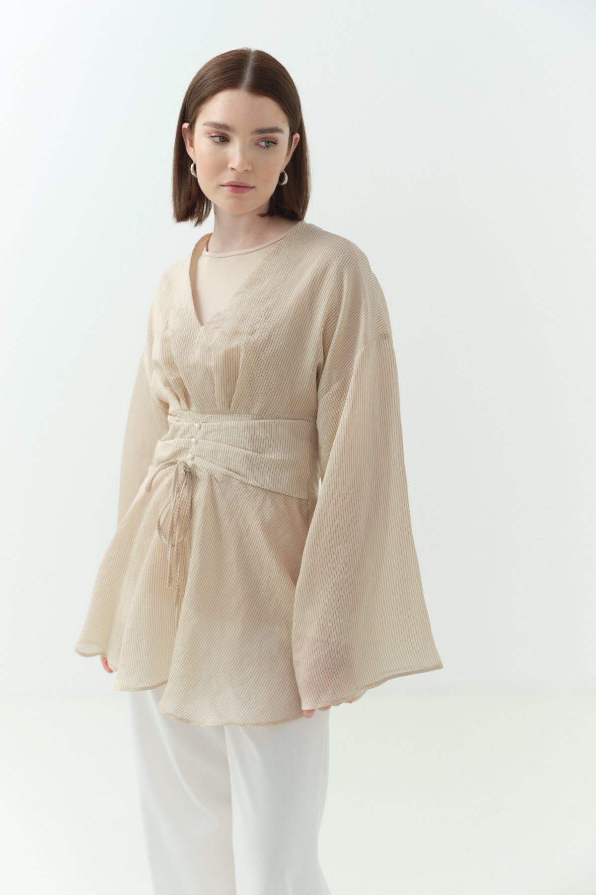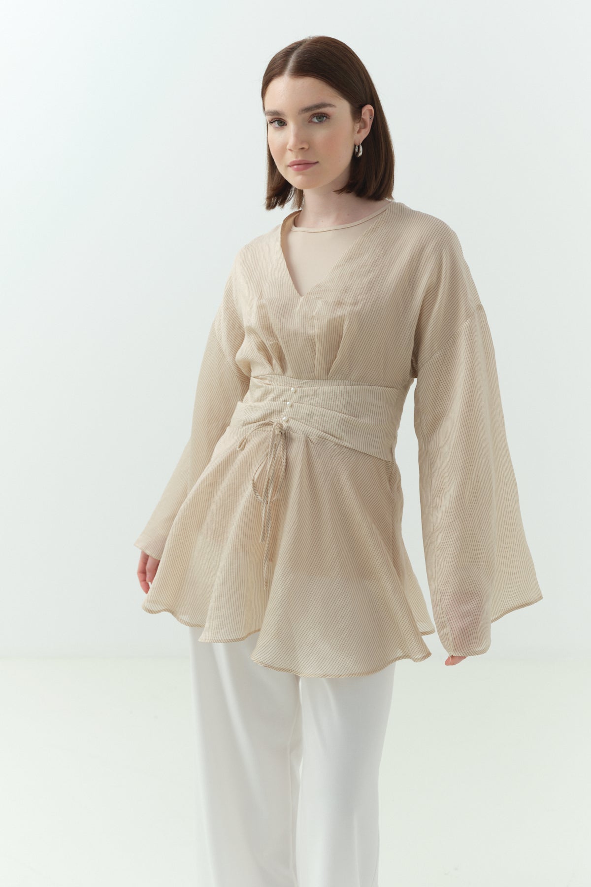 Püskül Detaylı Keten İkili Takım - Bej