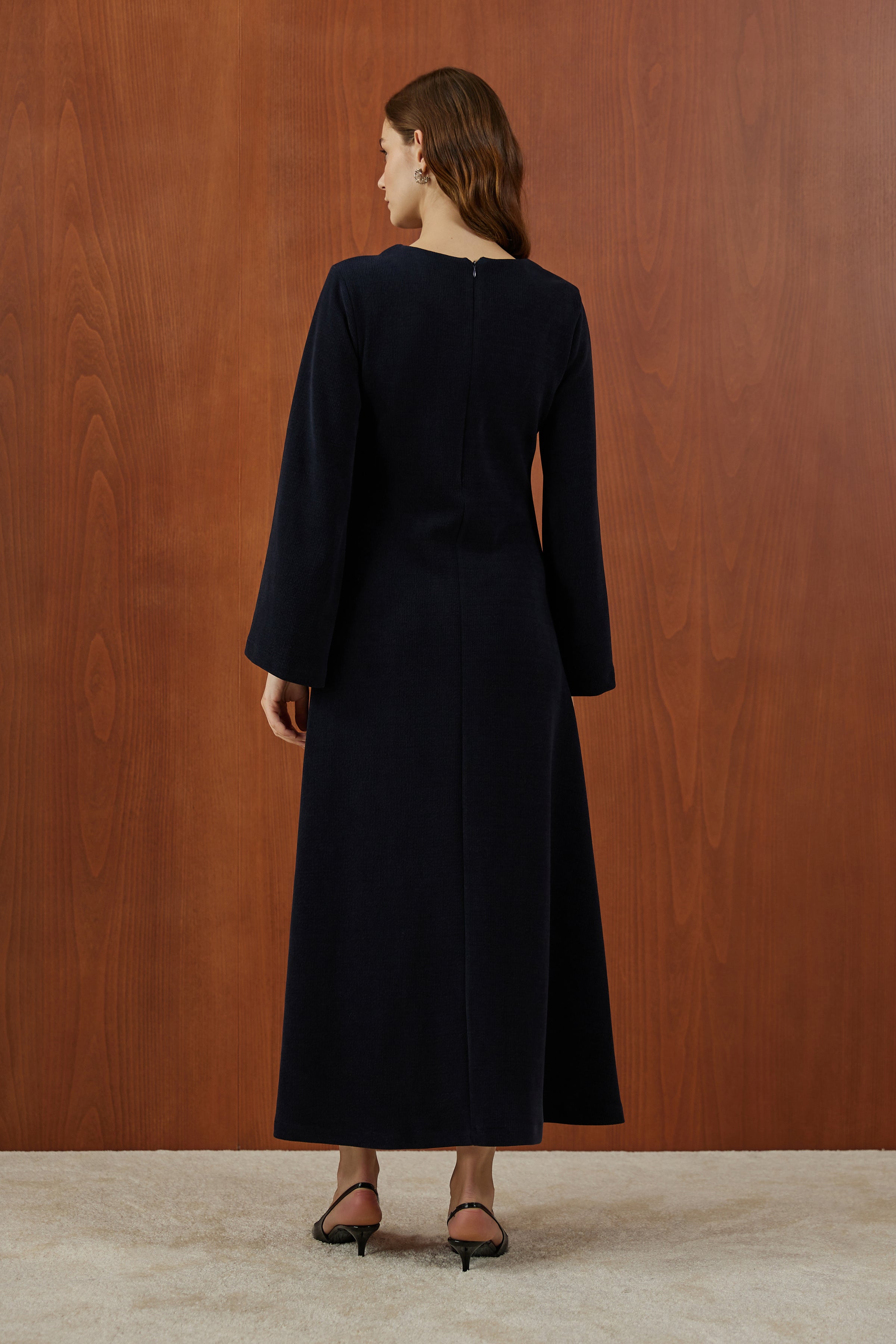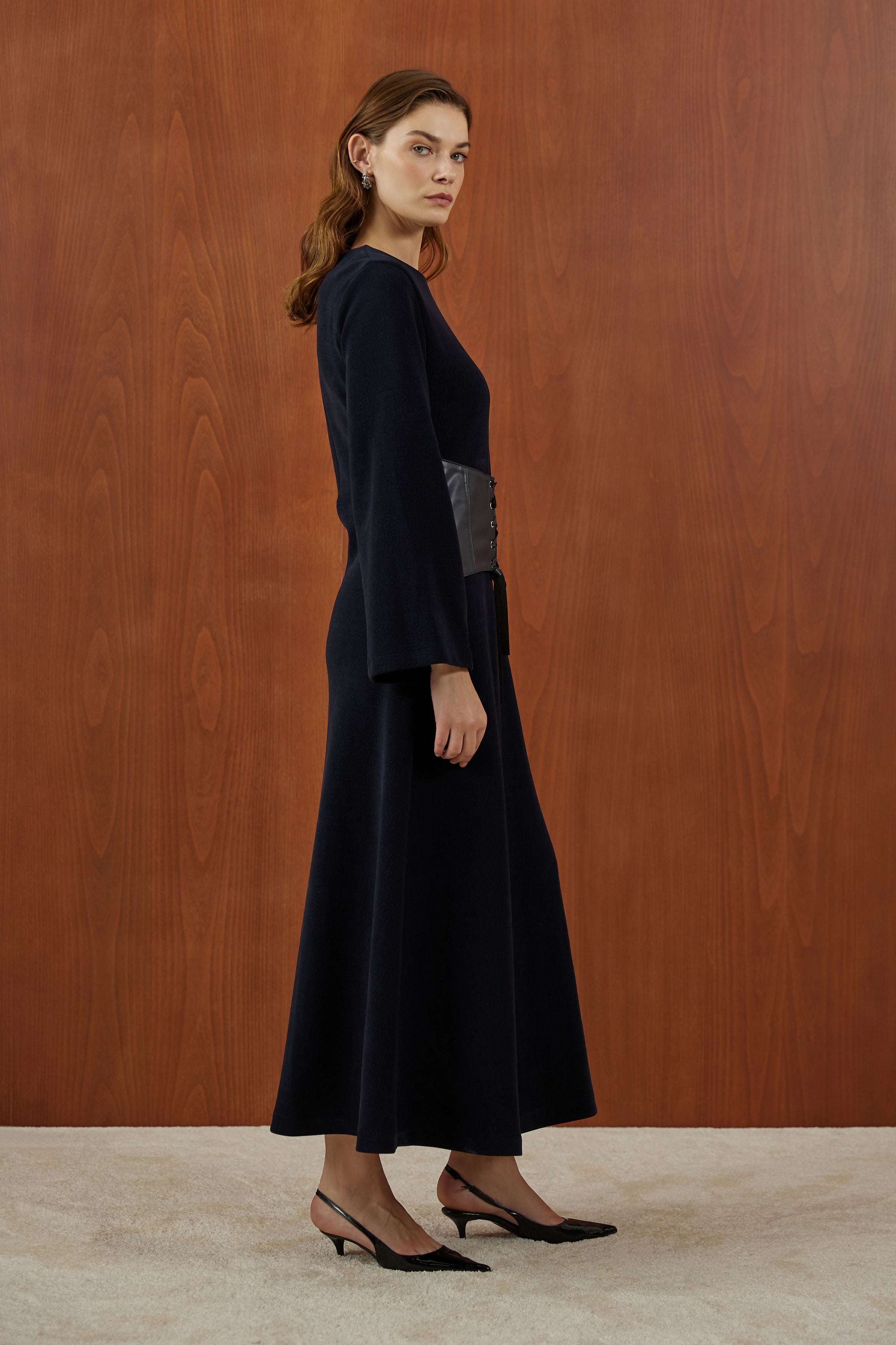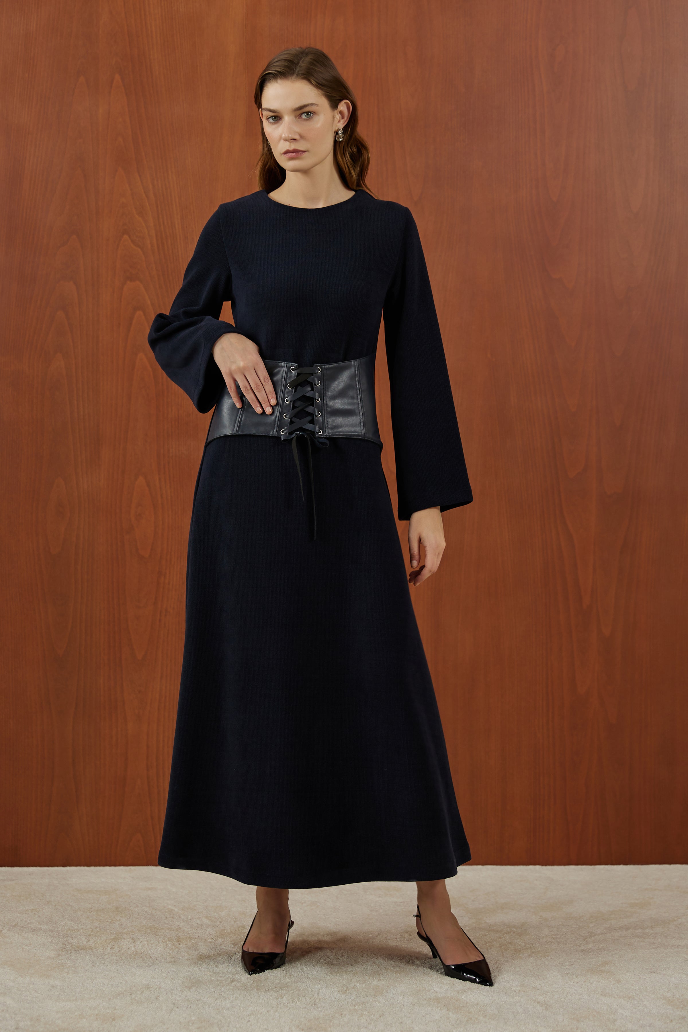 Yaka Detaylı Kuşaklı Elbise - Bej