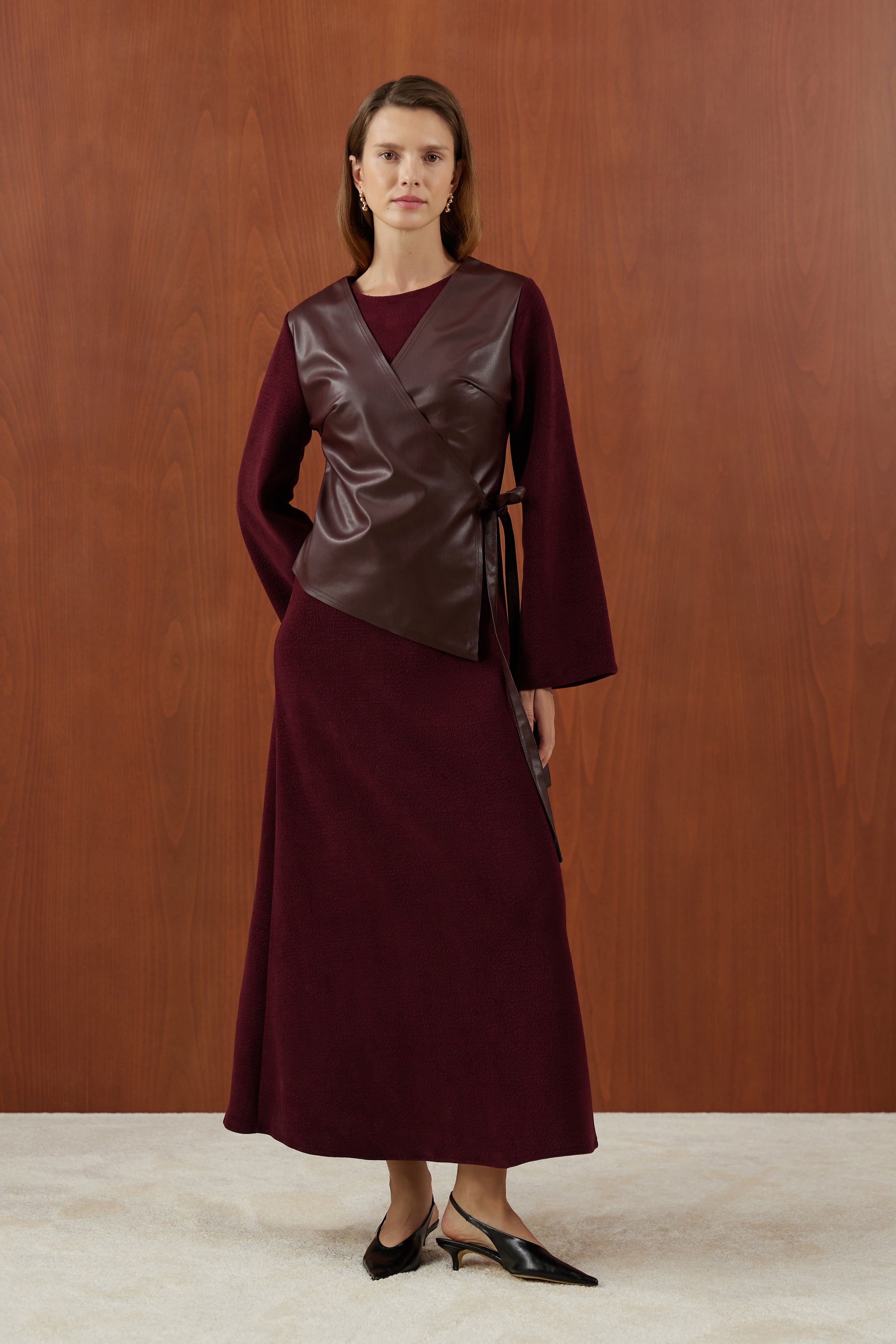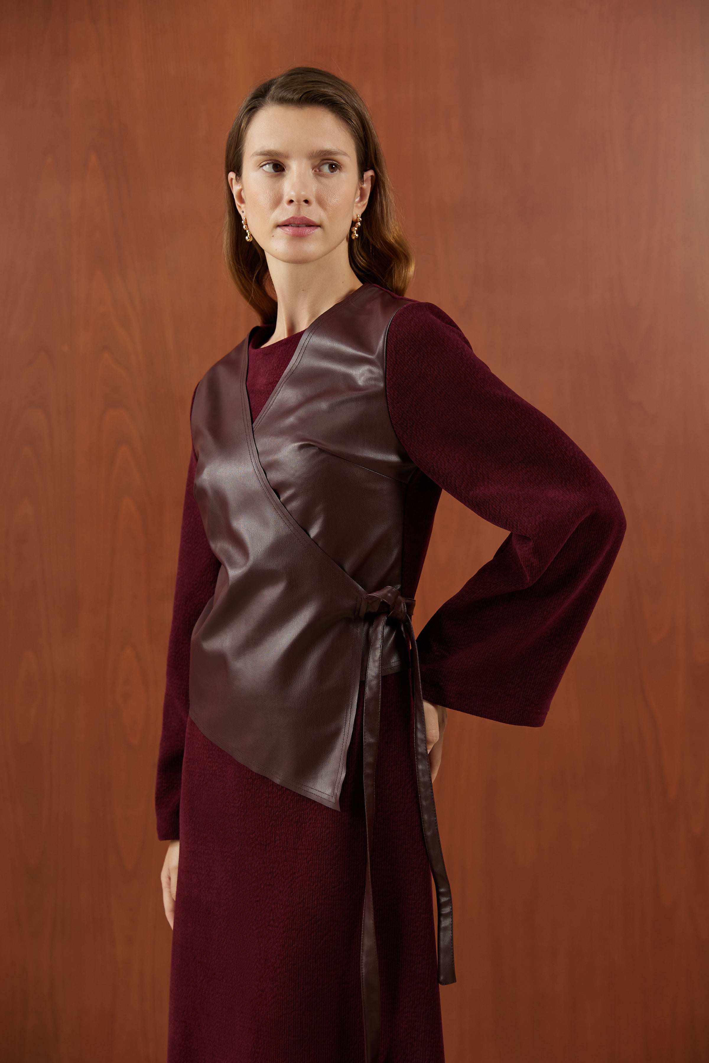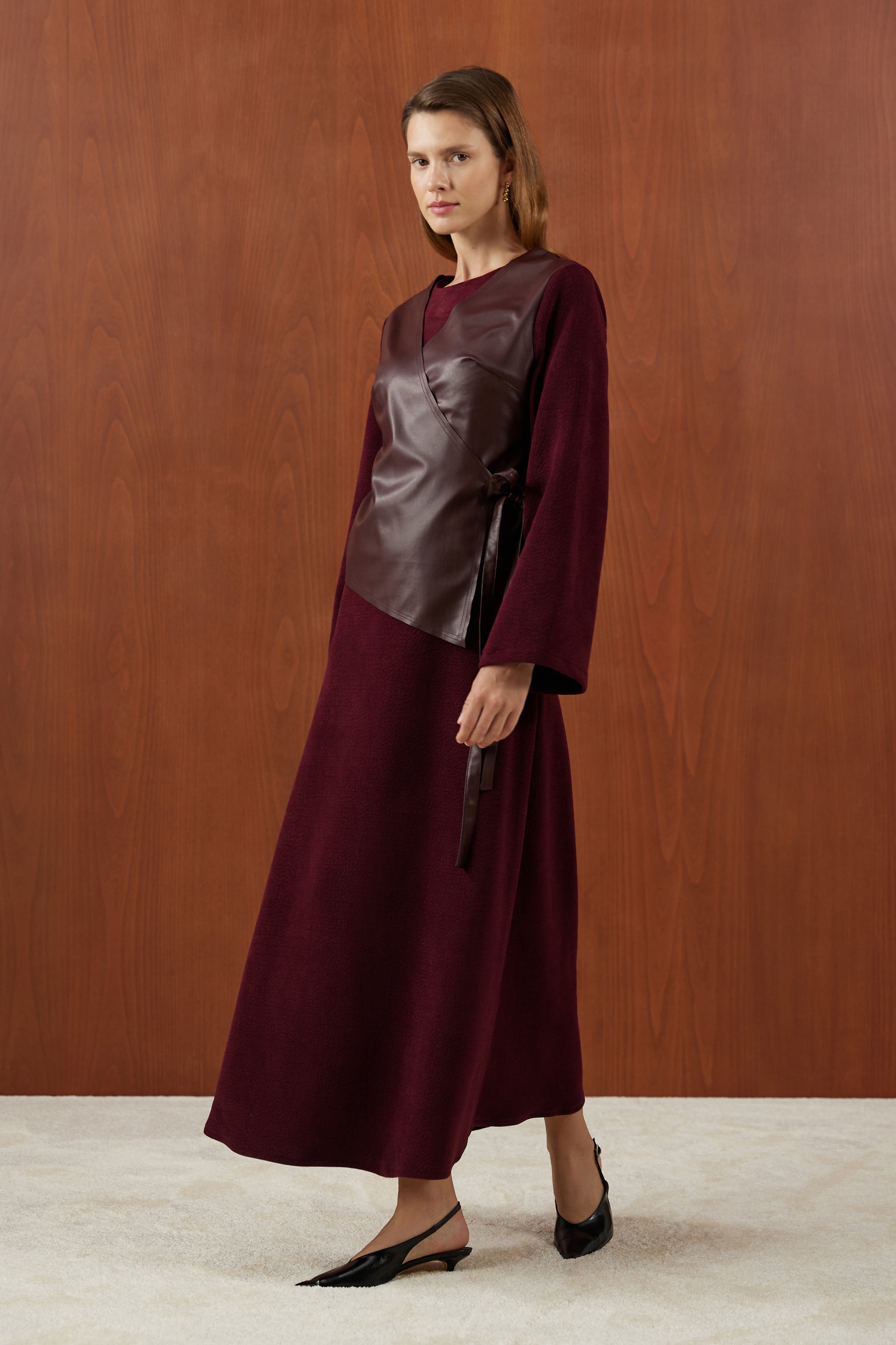 Bordo Deri Yelekli Yalancı İkili Triko Elbise