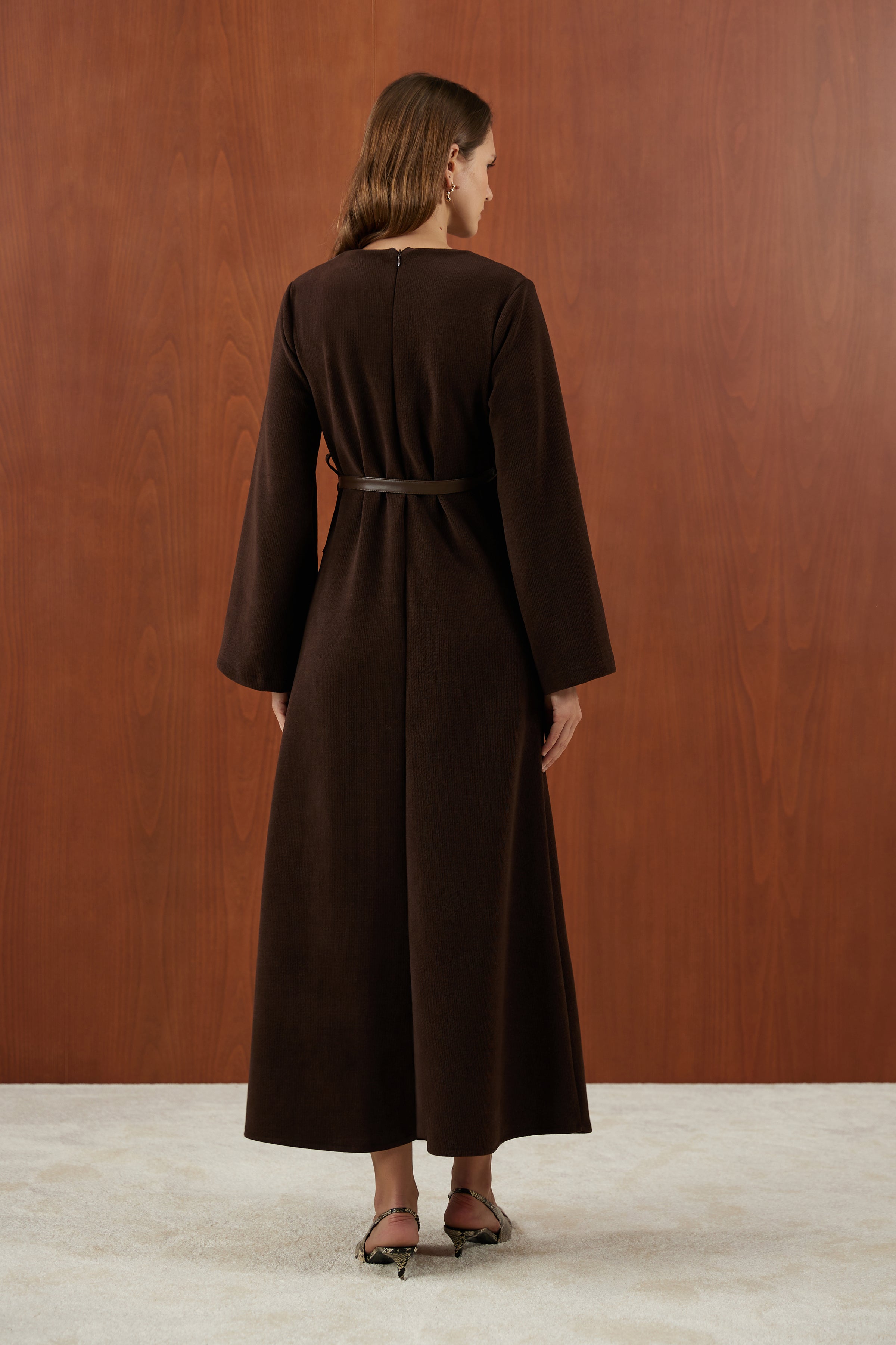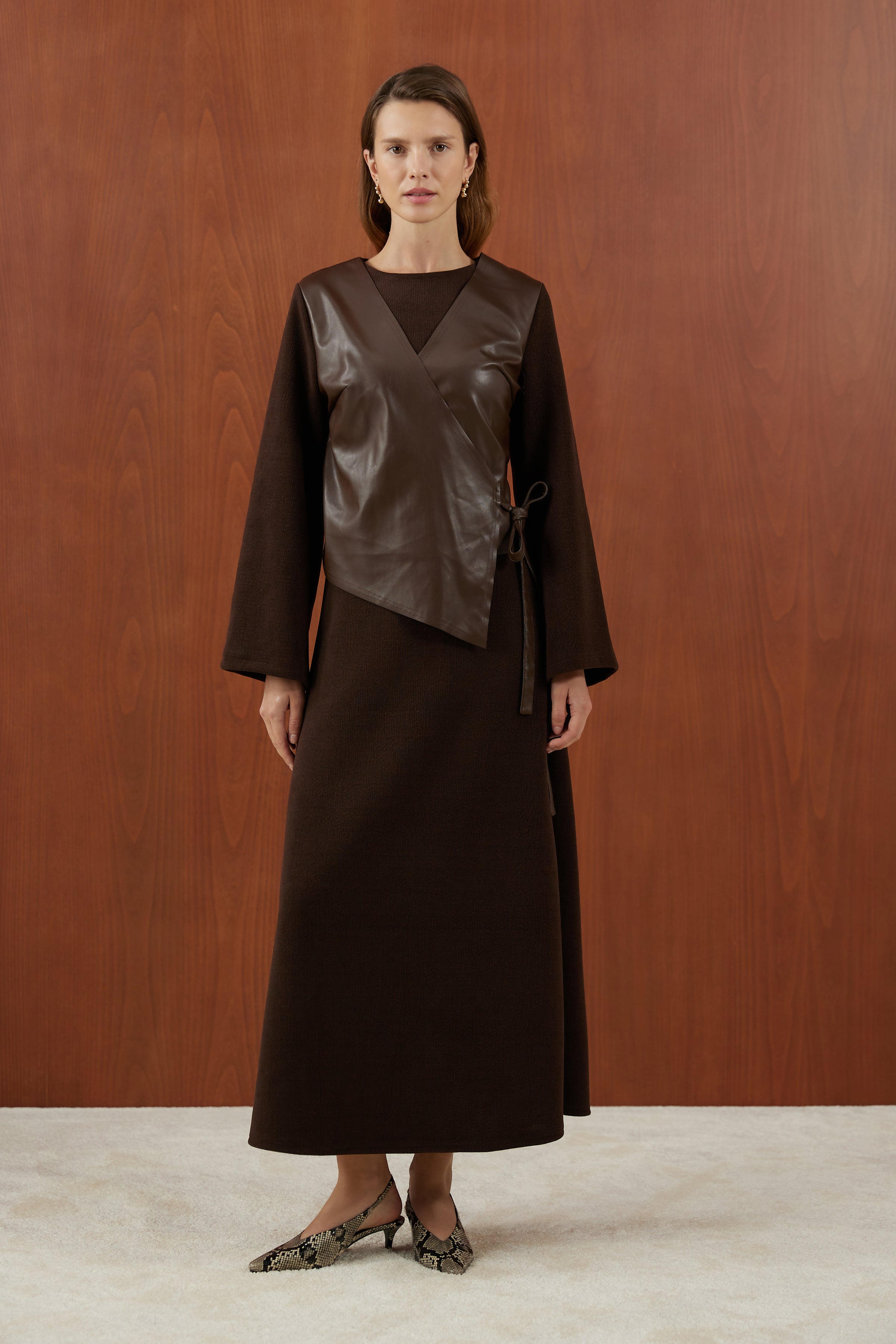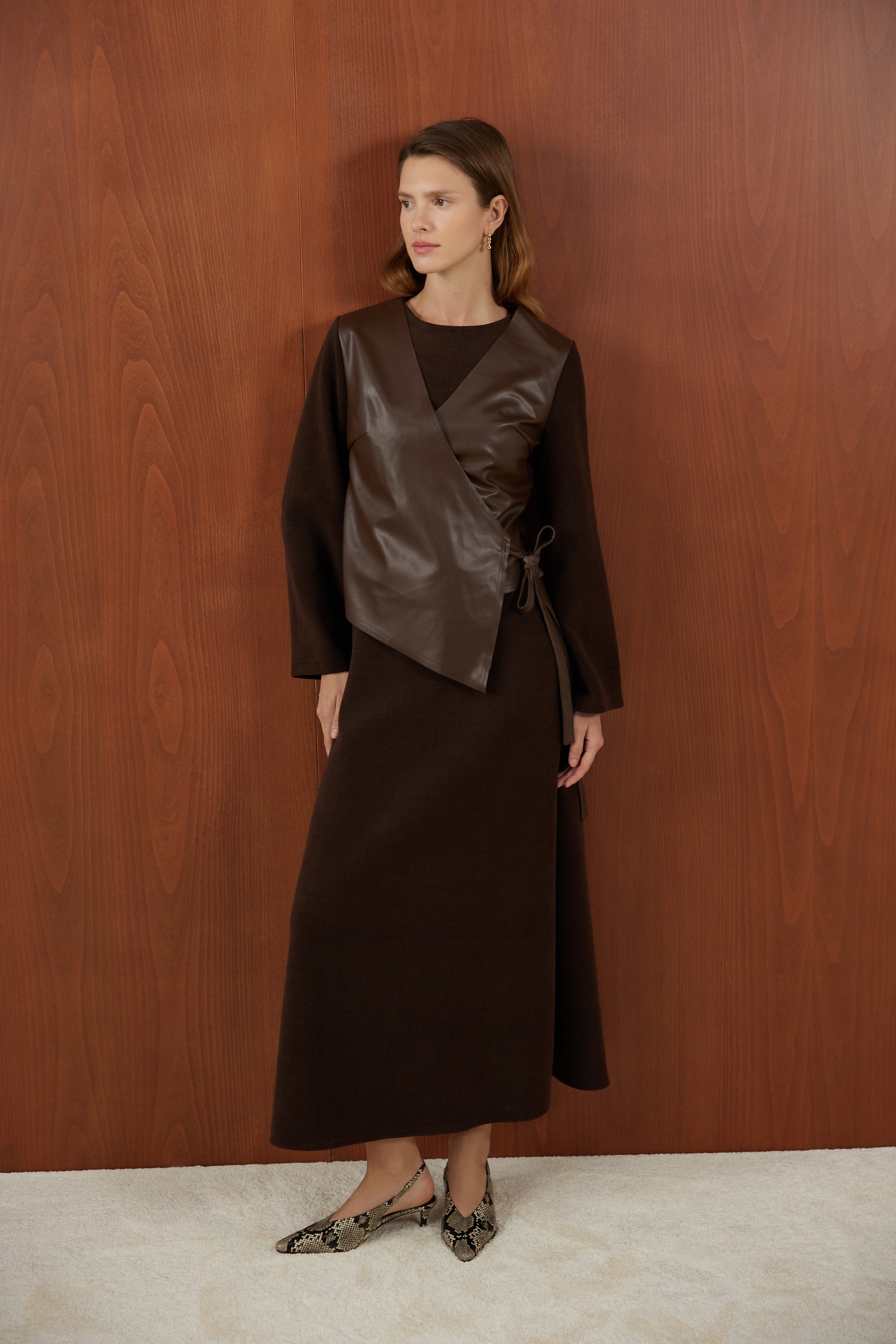 Kahverengi Deri Yelekli Yalancı İkili Triko Elbise