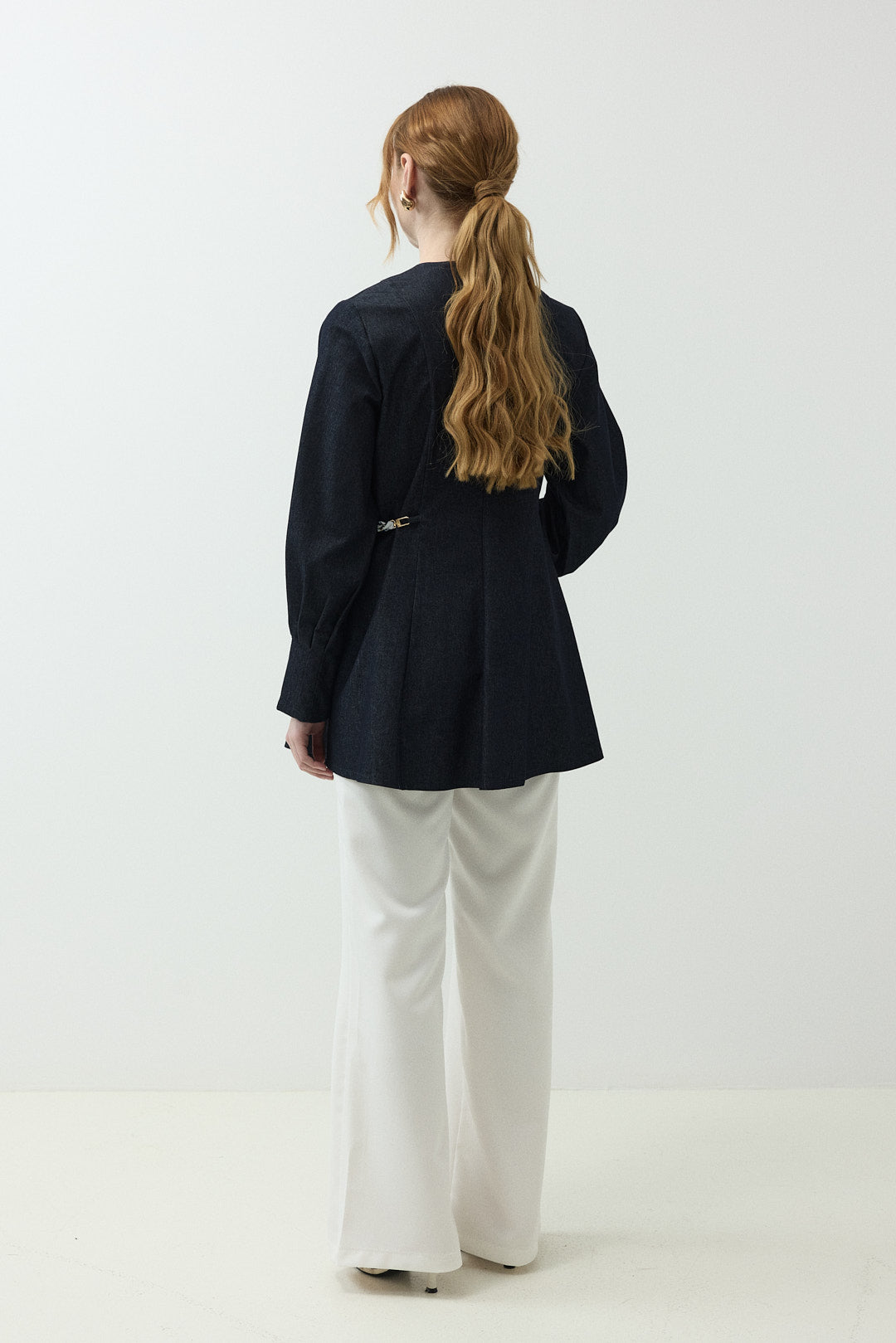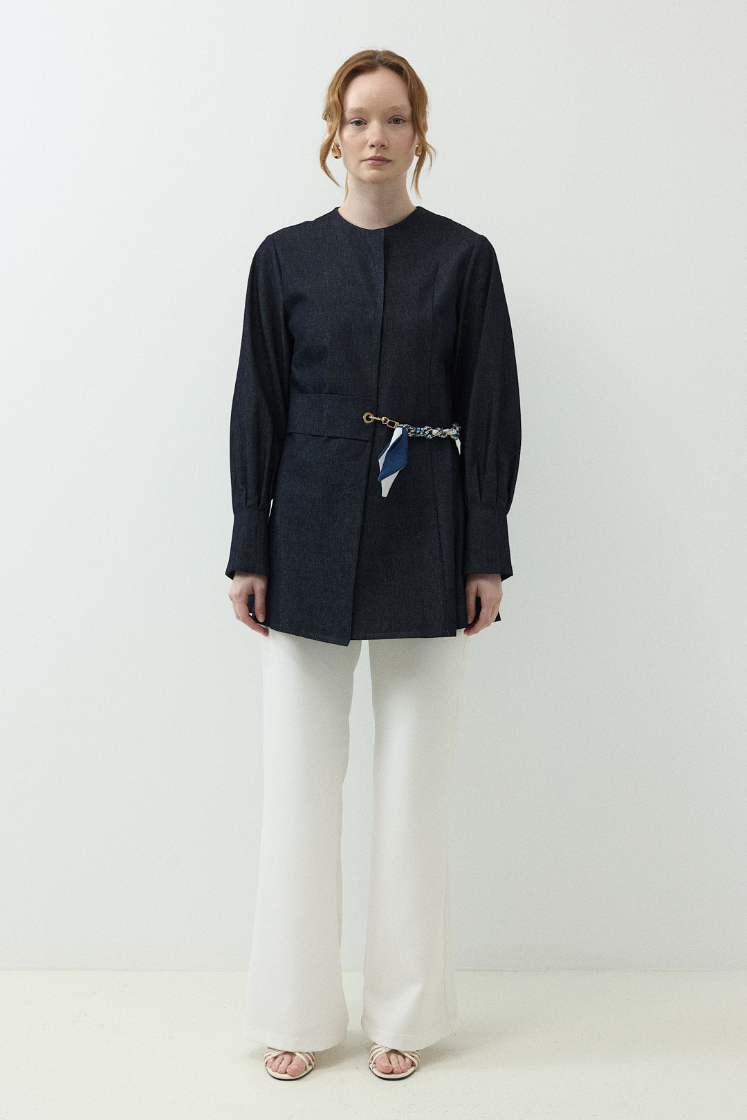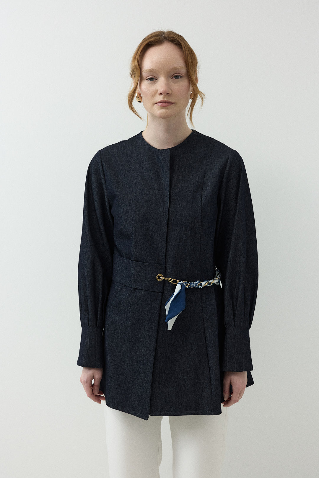 Fular Kemer Detaylı Gabardin Kot Ceket Lacivert