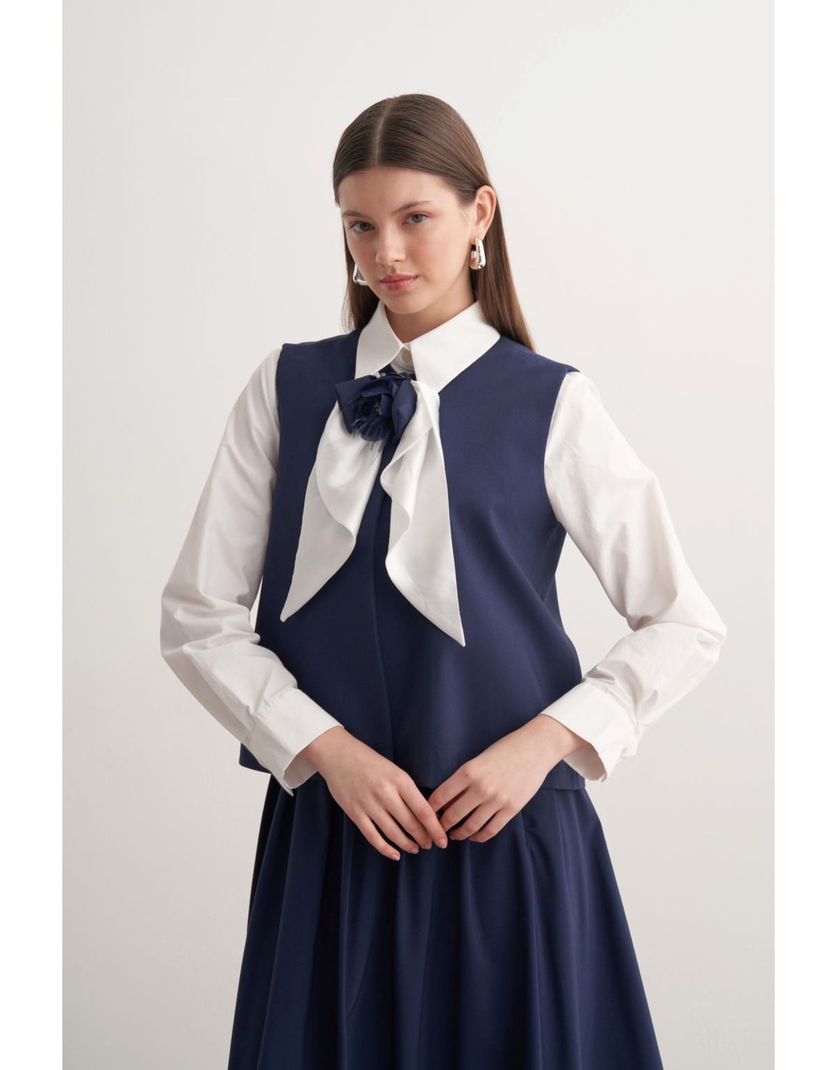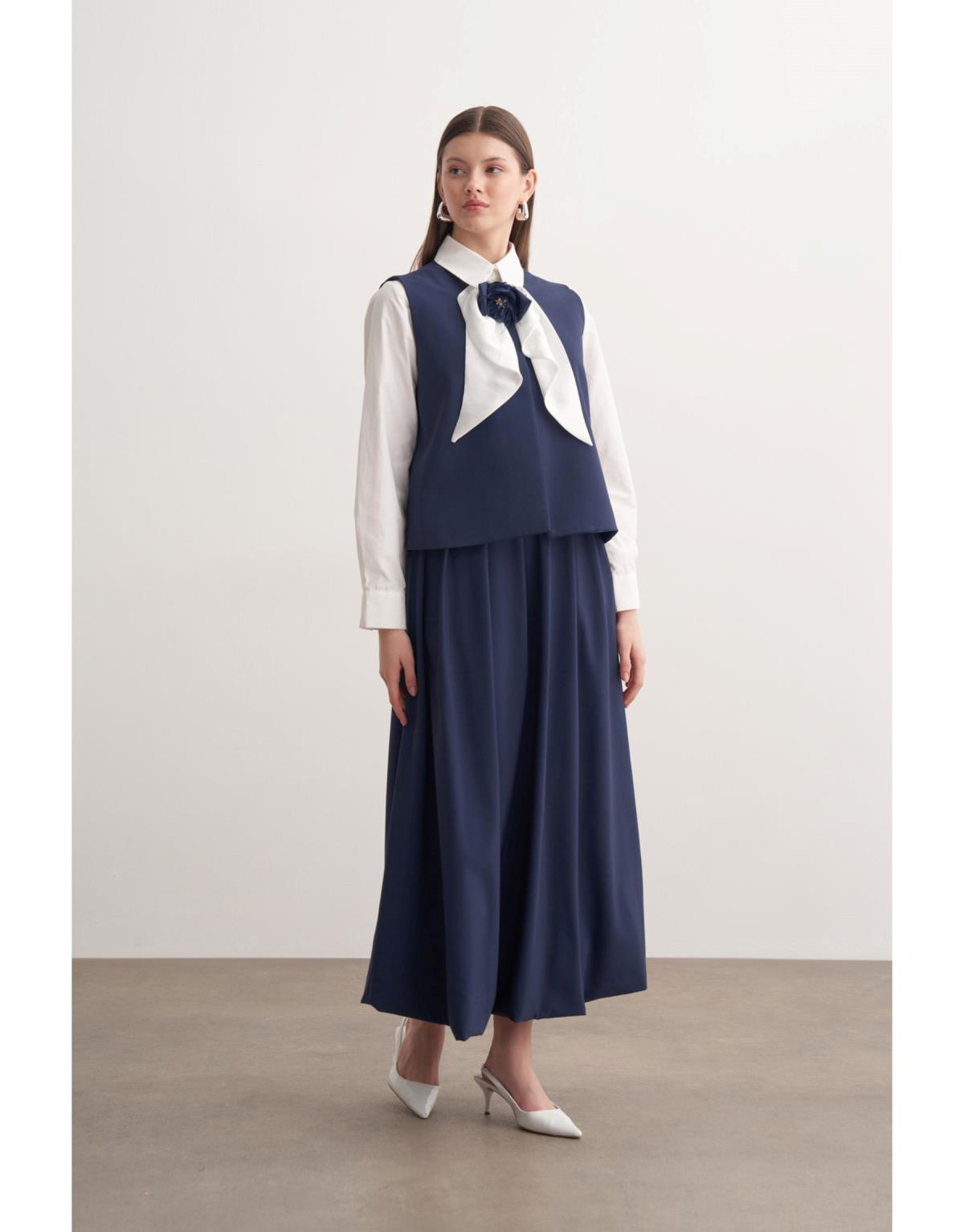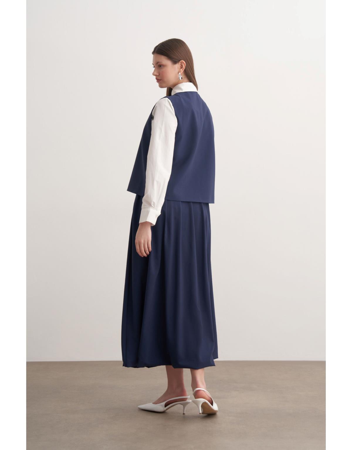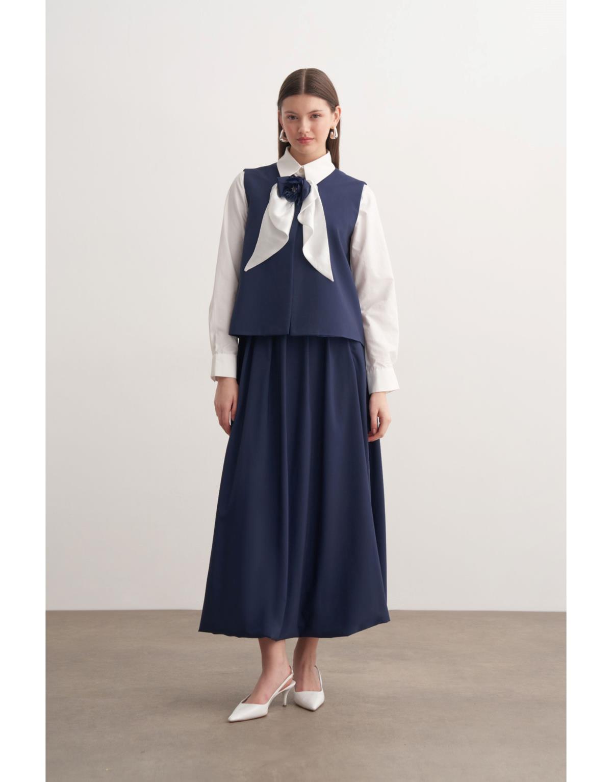Takım Poliviscon kumaştan üretilmiştir. Yelek çıtçıt detaylıdır, eteğiin üst kısmı pile detayı mevcuttur. Bel kısmı fermuarlıdır ve balon formundadır. Seyyar gül detayı mevcuttur.