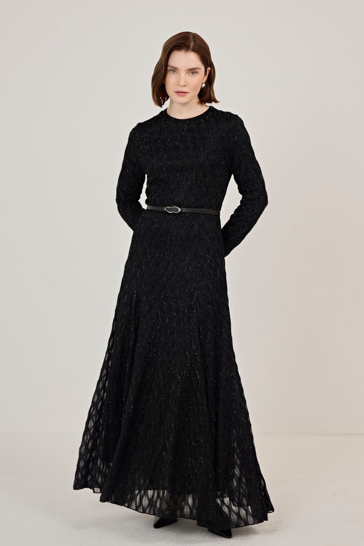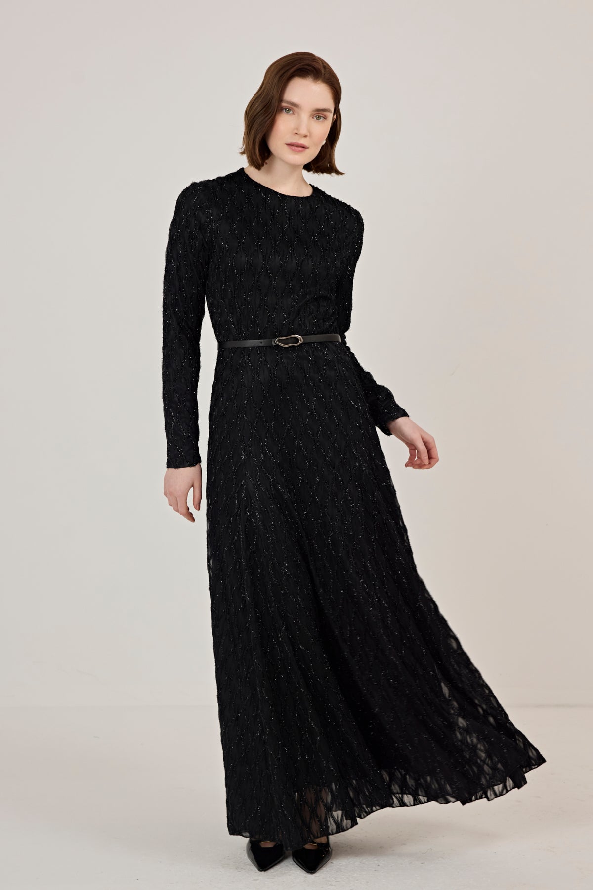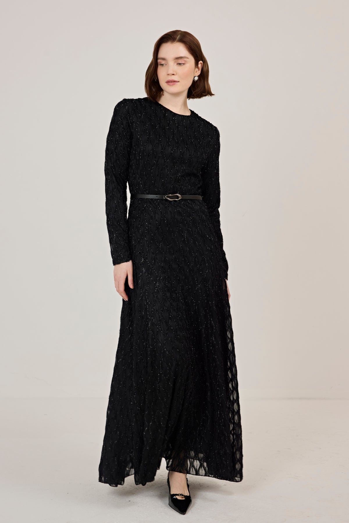 Tam boy tasarlanan bu model, ince ışıltılı dokuma yüzeyi ve akıcı formu ile zarif bir siluet sunar. Yuvarlak yaka ve uzun kol tasarımı klasik ve dengeli bir görünüm oluştururken, bel kısmındaki ince kemer detayı vücut hatlarını nazikçe vurgular.