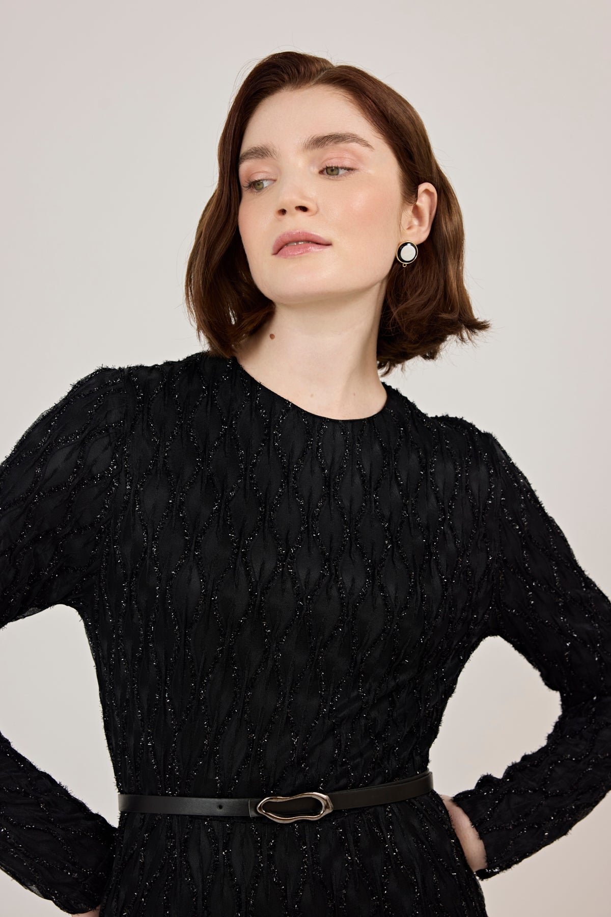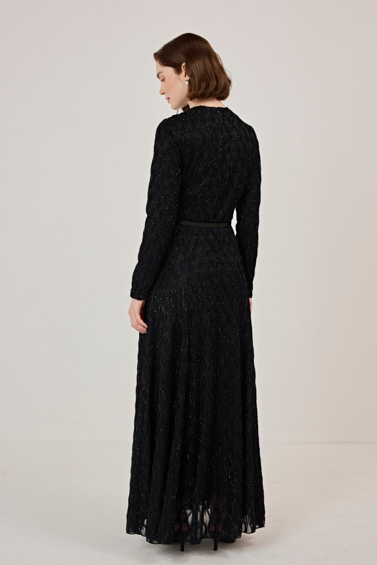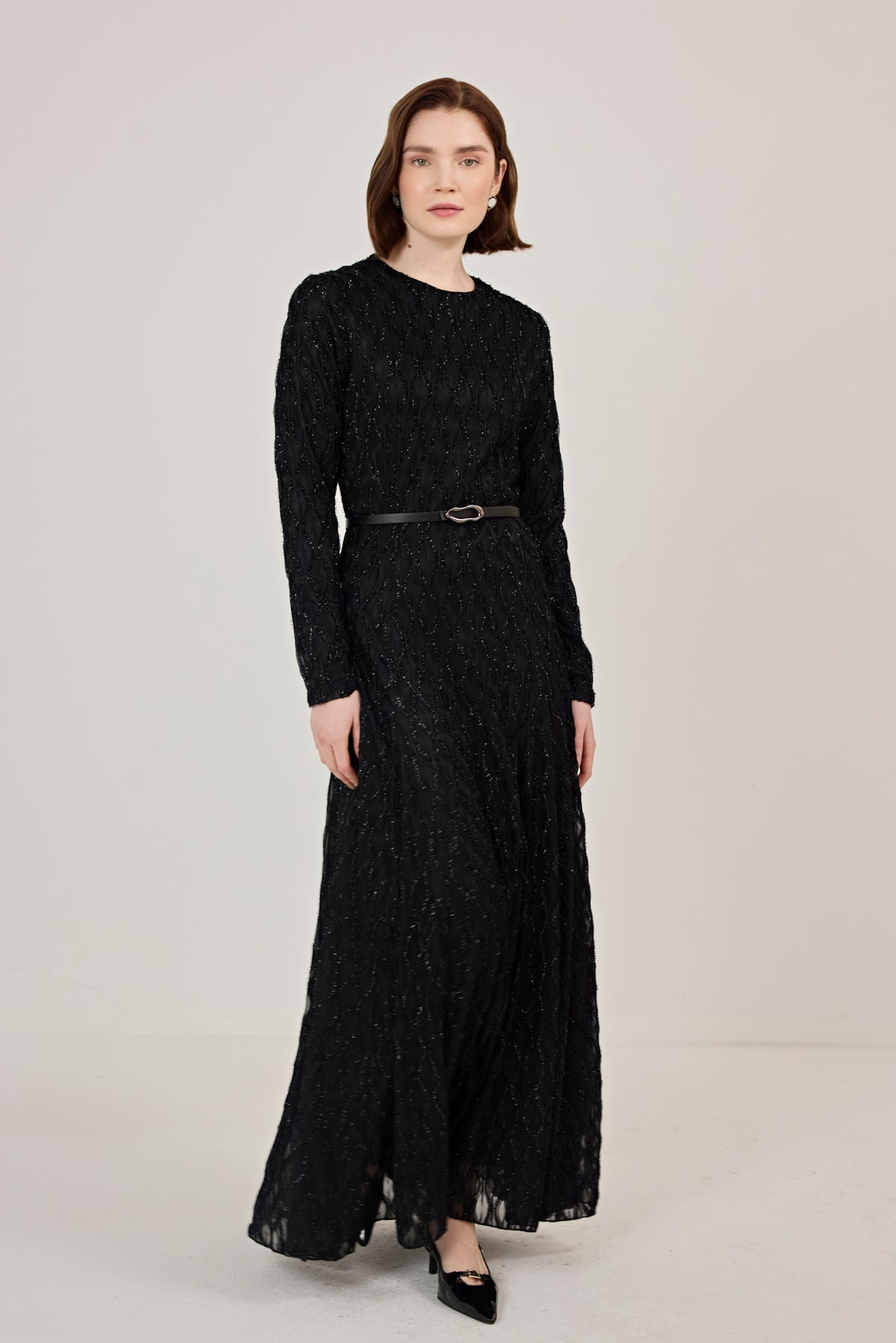 Tam boy tasarlanan bu model, ince ışıltılı dokuma yüzeyi ve akıcı formu ile zarif bir siluet sunar. Yuvarlak yaka ve uzun kol tasarımı klasik ve dengeli bir görünüm oluştururken, bel kısmındaki ince kemer detayı vücut hatlarını nazikçe vurgular.