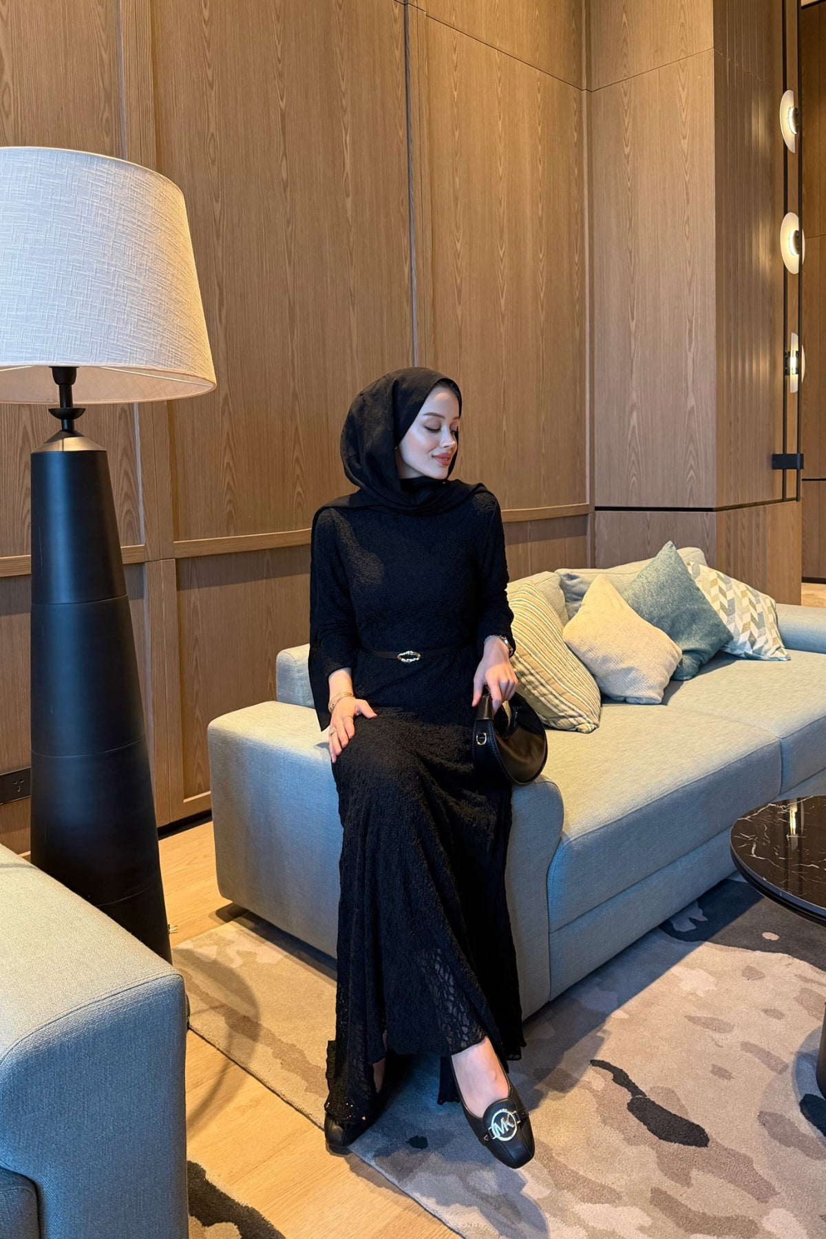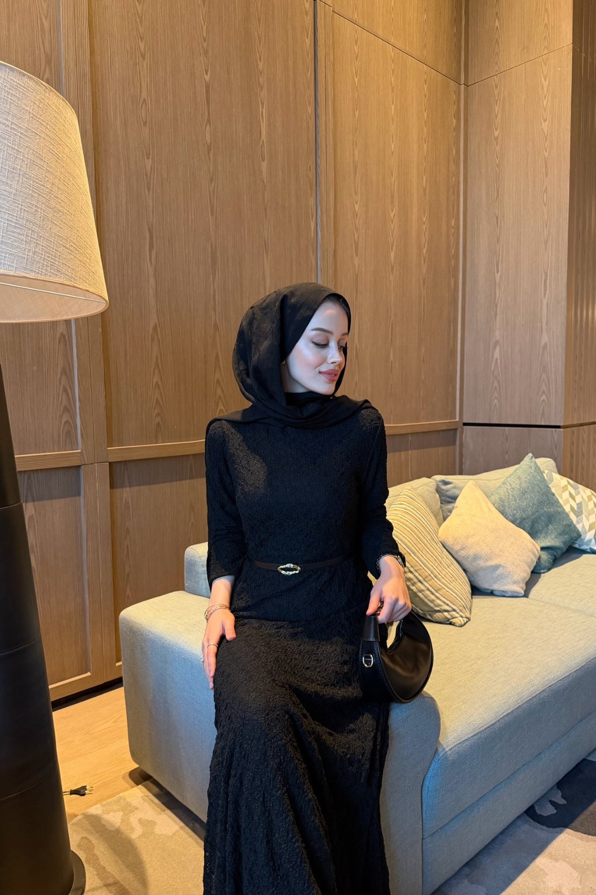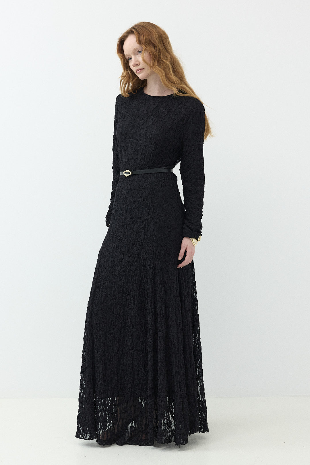 Kemerli Likralı Dantel Elbise Siyah
