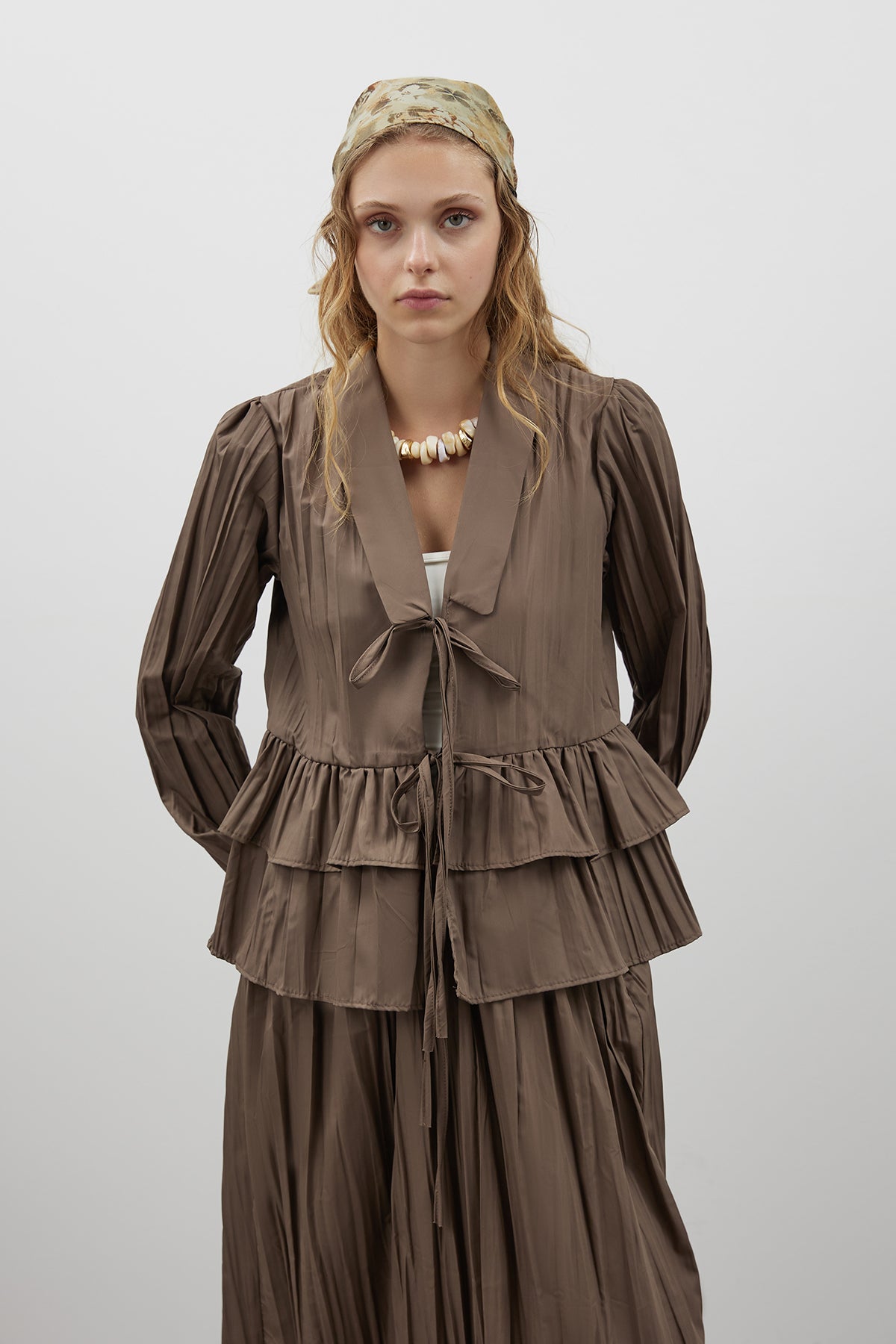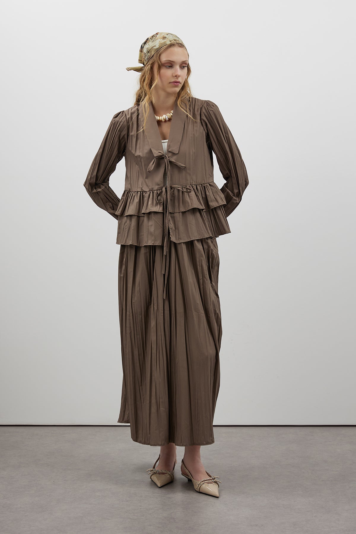 Romantik Detaylar: Bluzun omuzlarındaki ve ön kısmındaki fırfırlar ile ayarlanabilir bağlama detayı, takıma hareketli ve zarif bir hava katar.