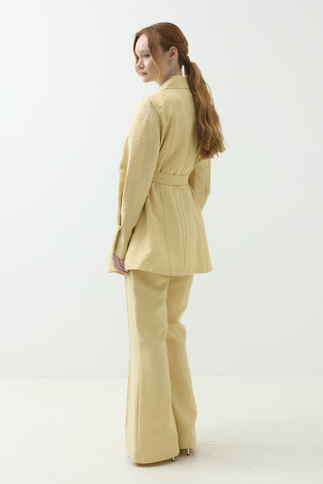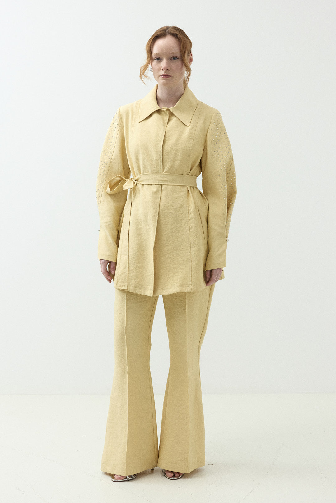 Kolları Taş Detaylı Pantolonlu Takım Sarı