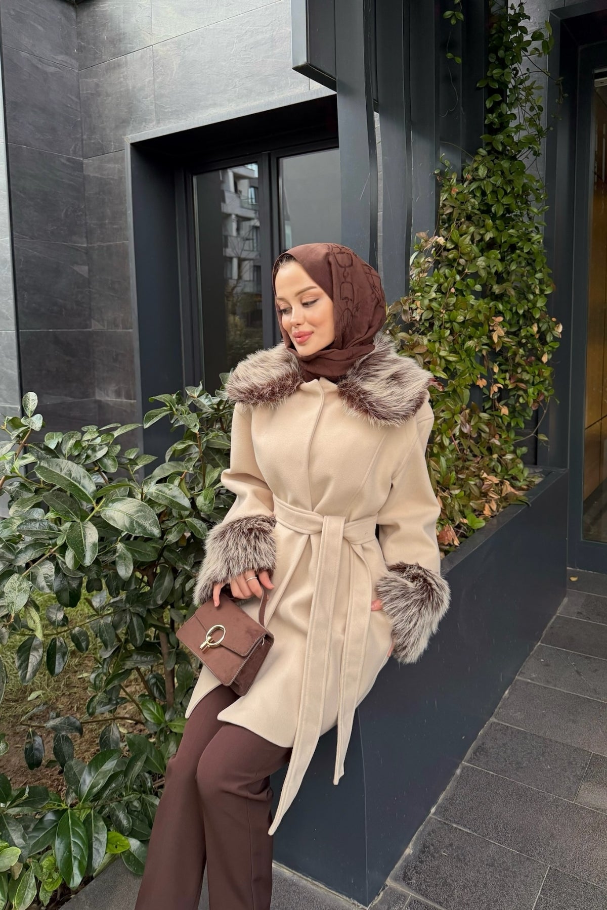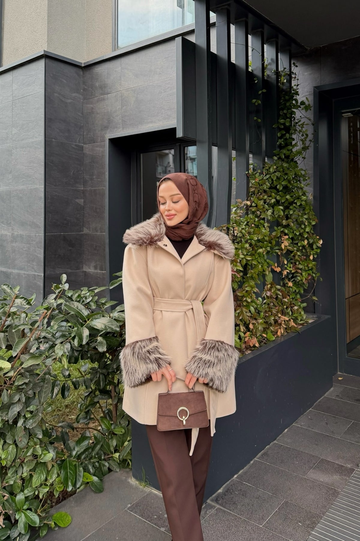 Kürk Detaylı Kaşe Kaban