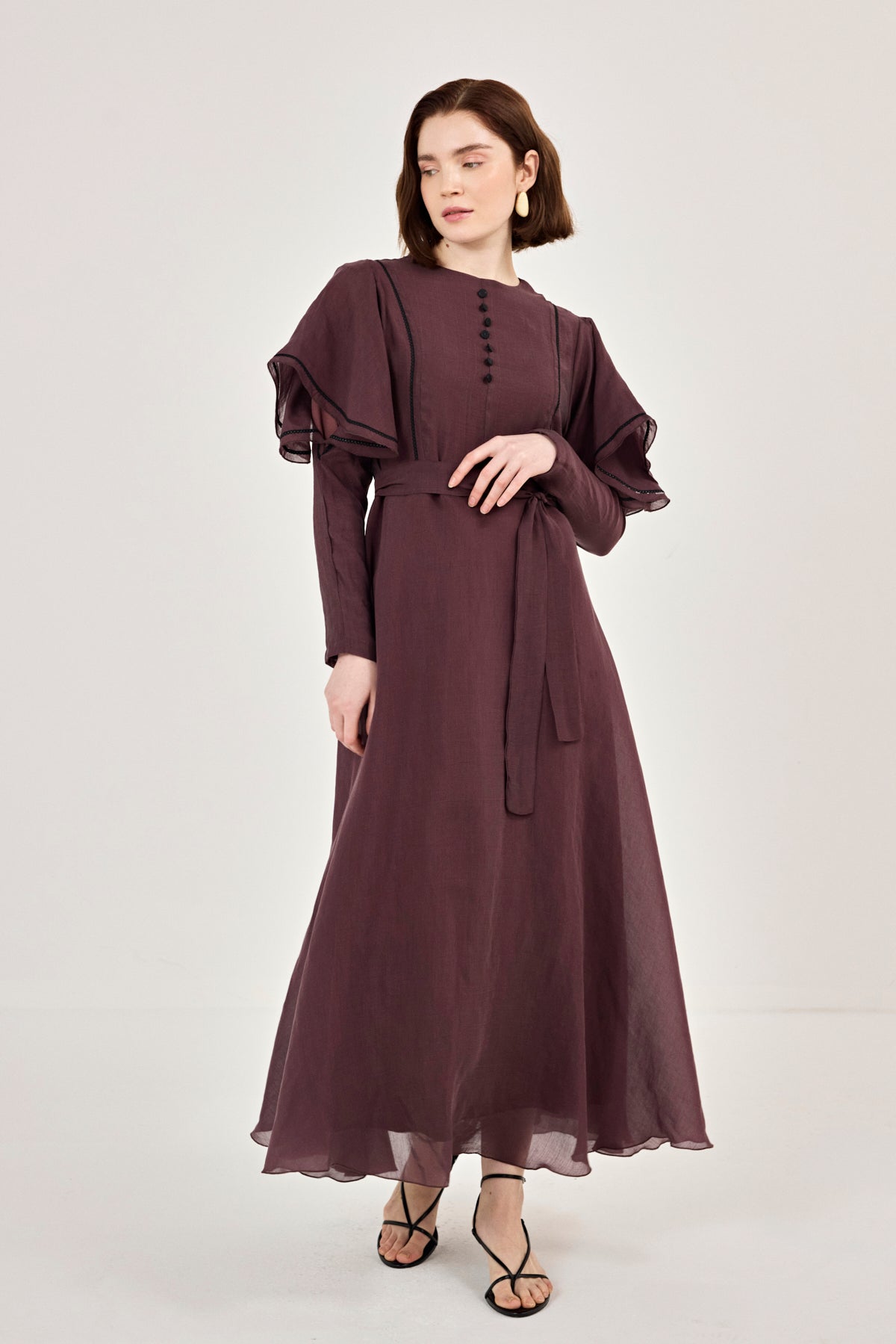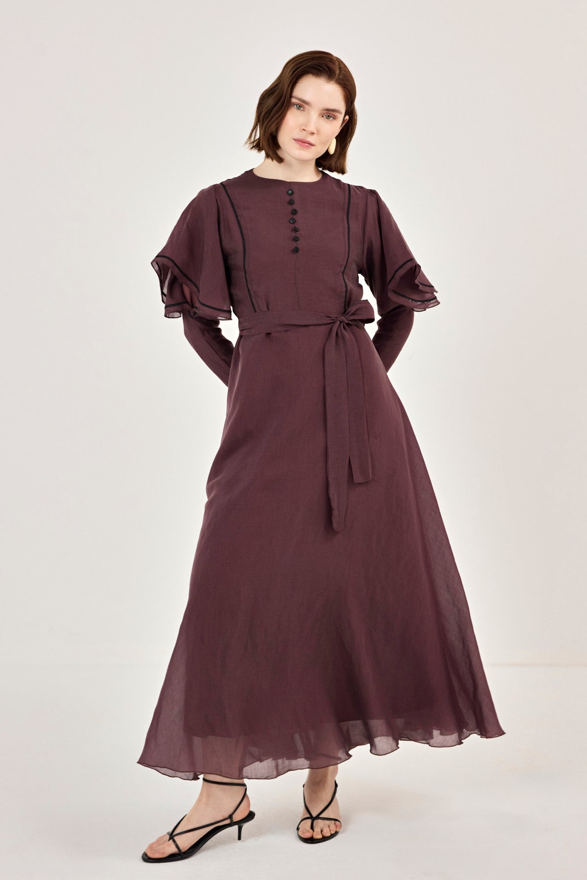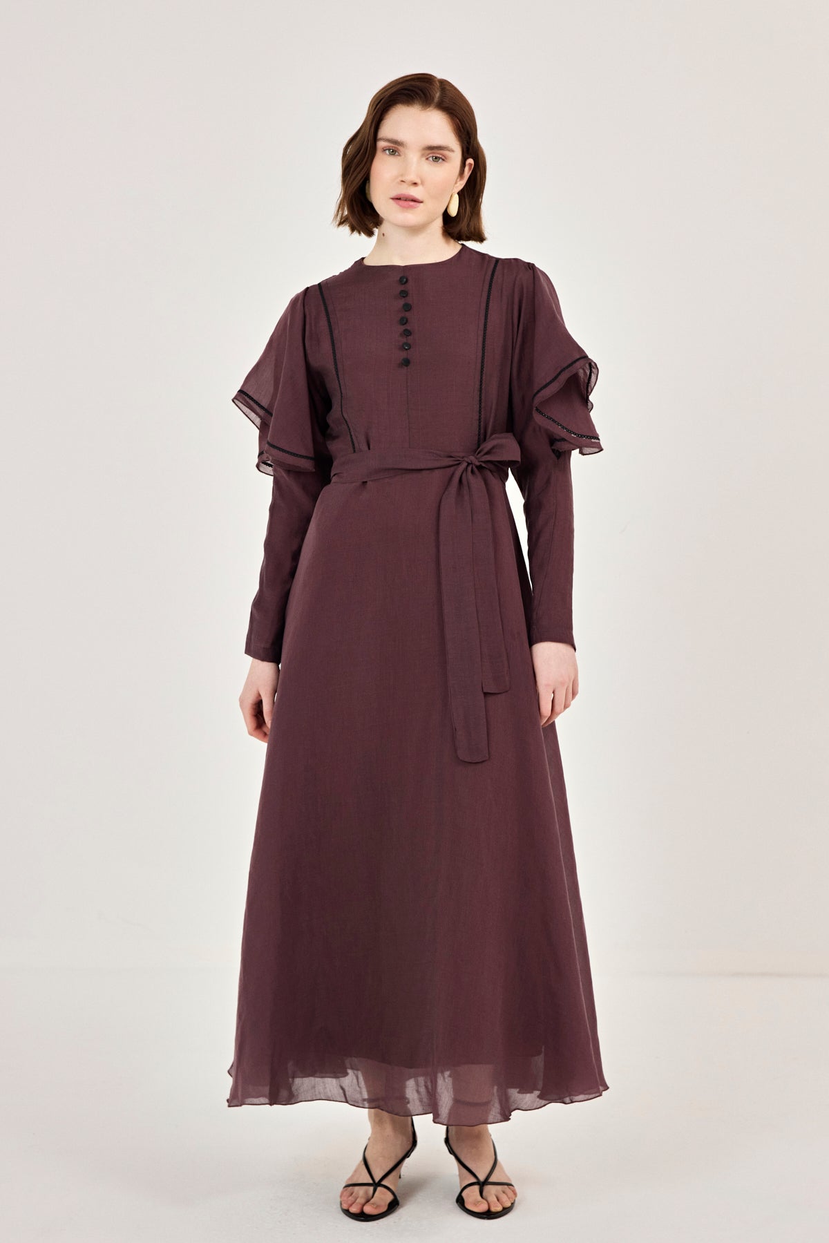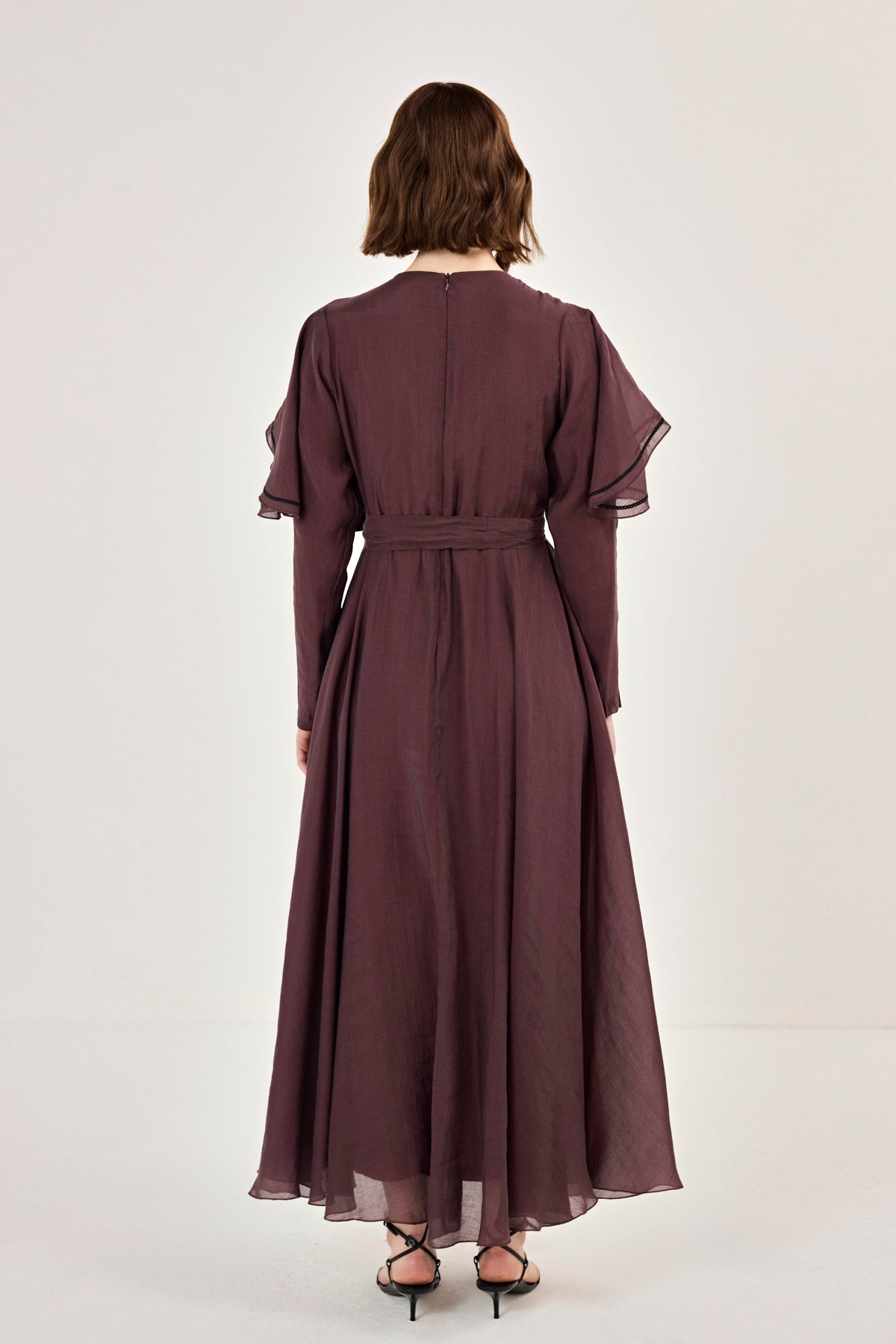Nakış Detaylı Volanlı Parlak Tensel Elbise Mürdüm