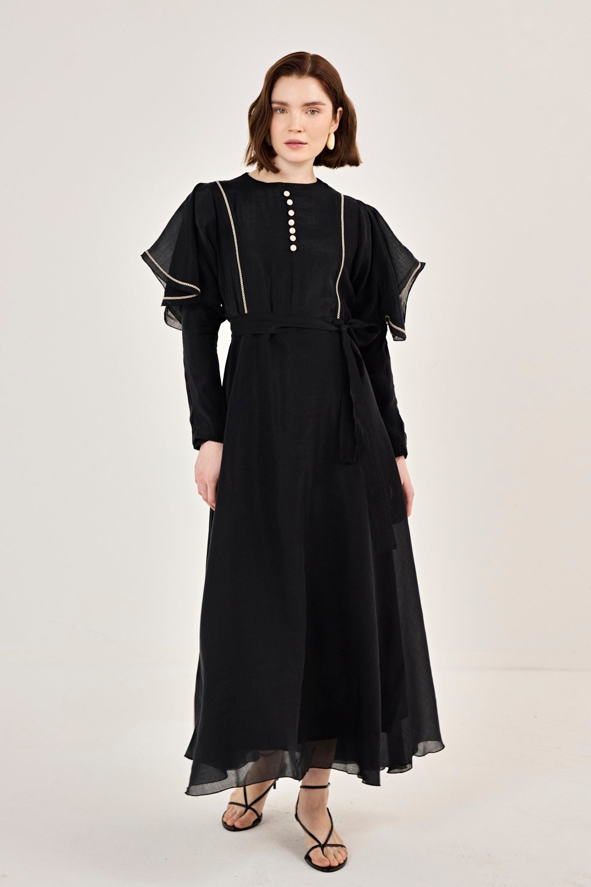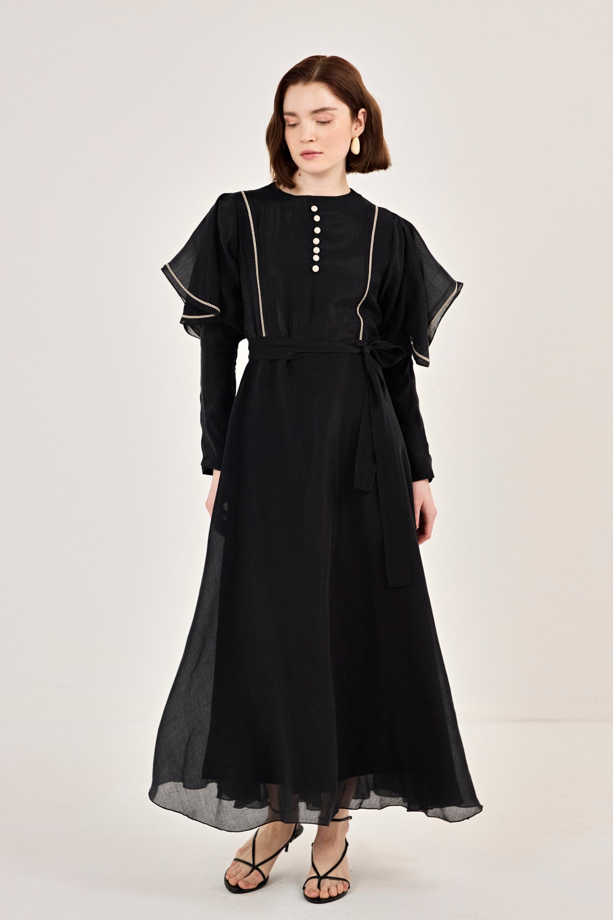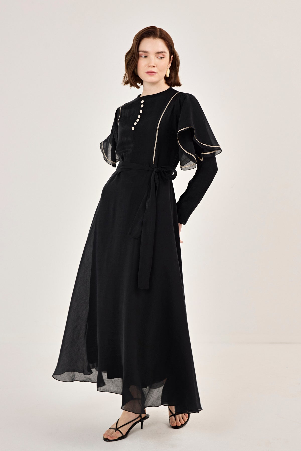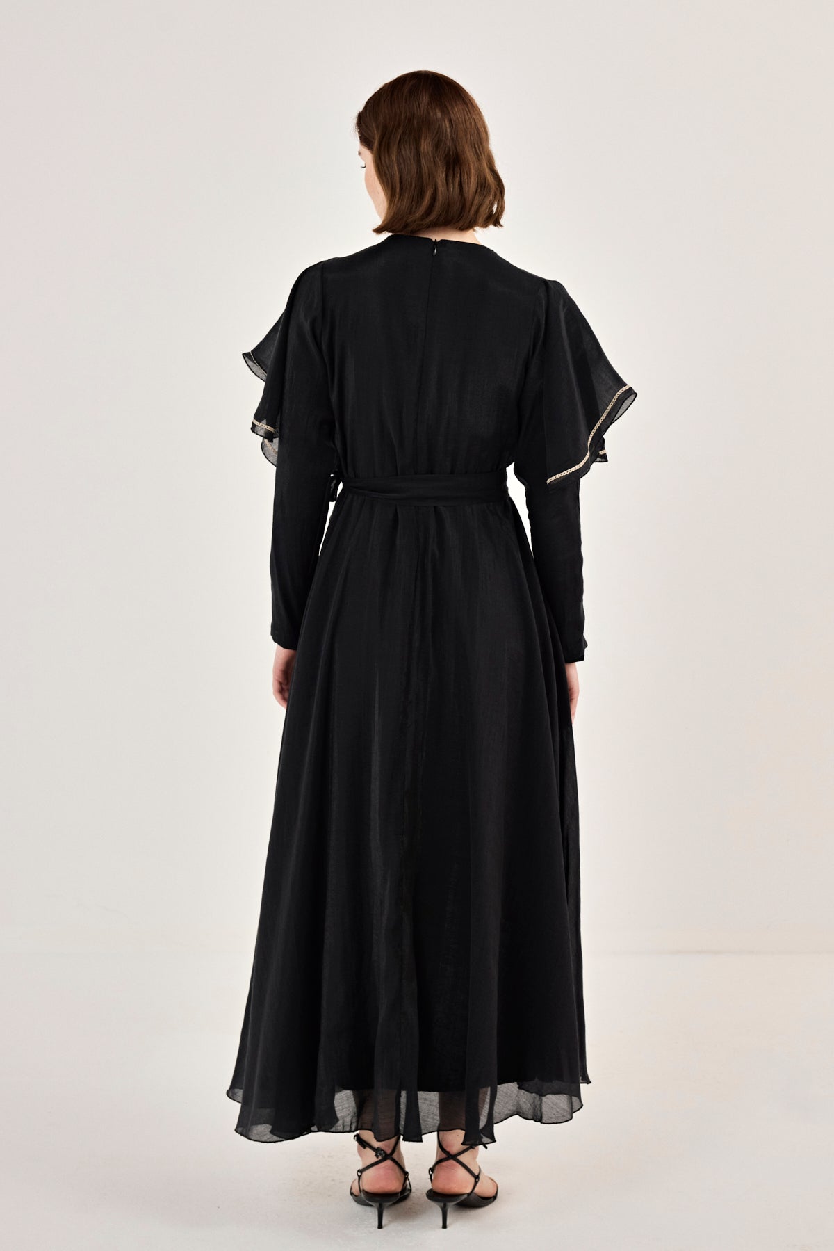 Nakış Detaylı Volanlı Parlak Tensel Elbise Siyah