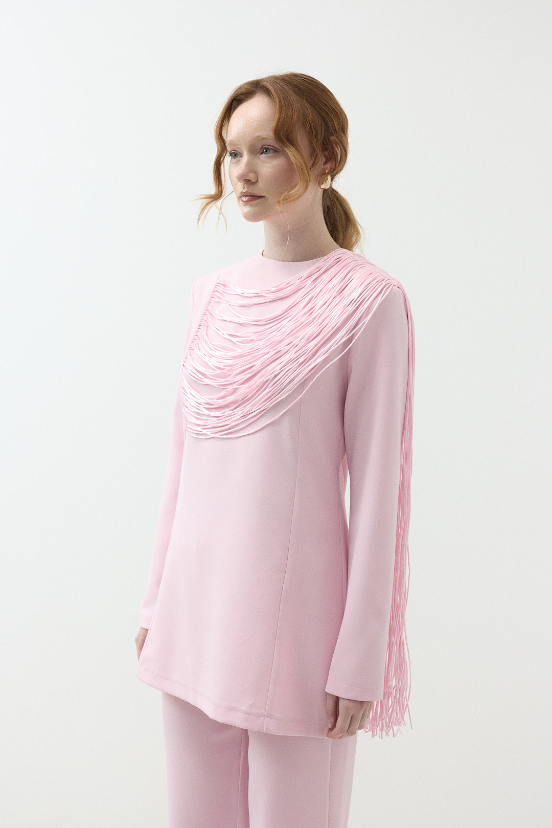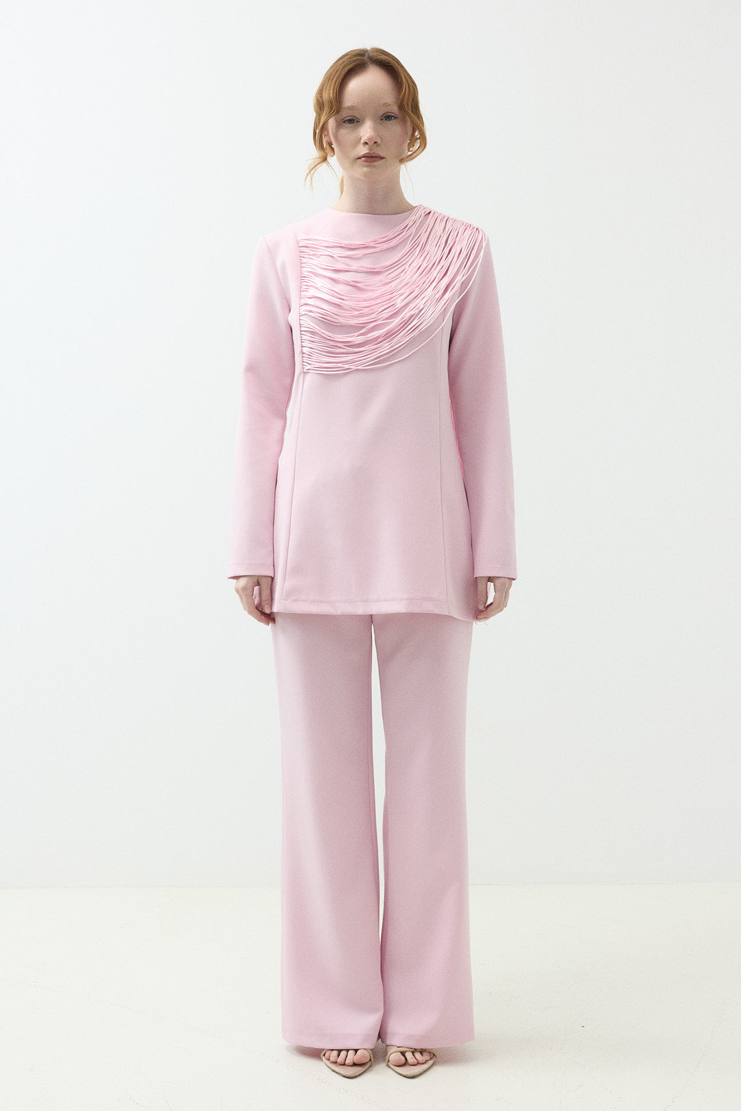 Püskül İp Detaylı Pantolonlu Takım, zarif detayları ve modern duruşuyla stilinize sofistike bir dokunuş katar. Üst parçasındaki özenle yerleştirilmiş püskül ip detayları tasarıma hareket kazandırırken, rahat kalıbıyla gün boyu konfor sunar. Düz kesim pantolonu ise vücuda nazikçe oturarak sade ve şık bir görünüm oluşturur.