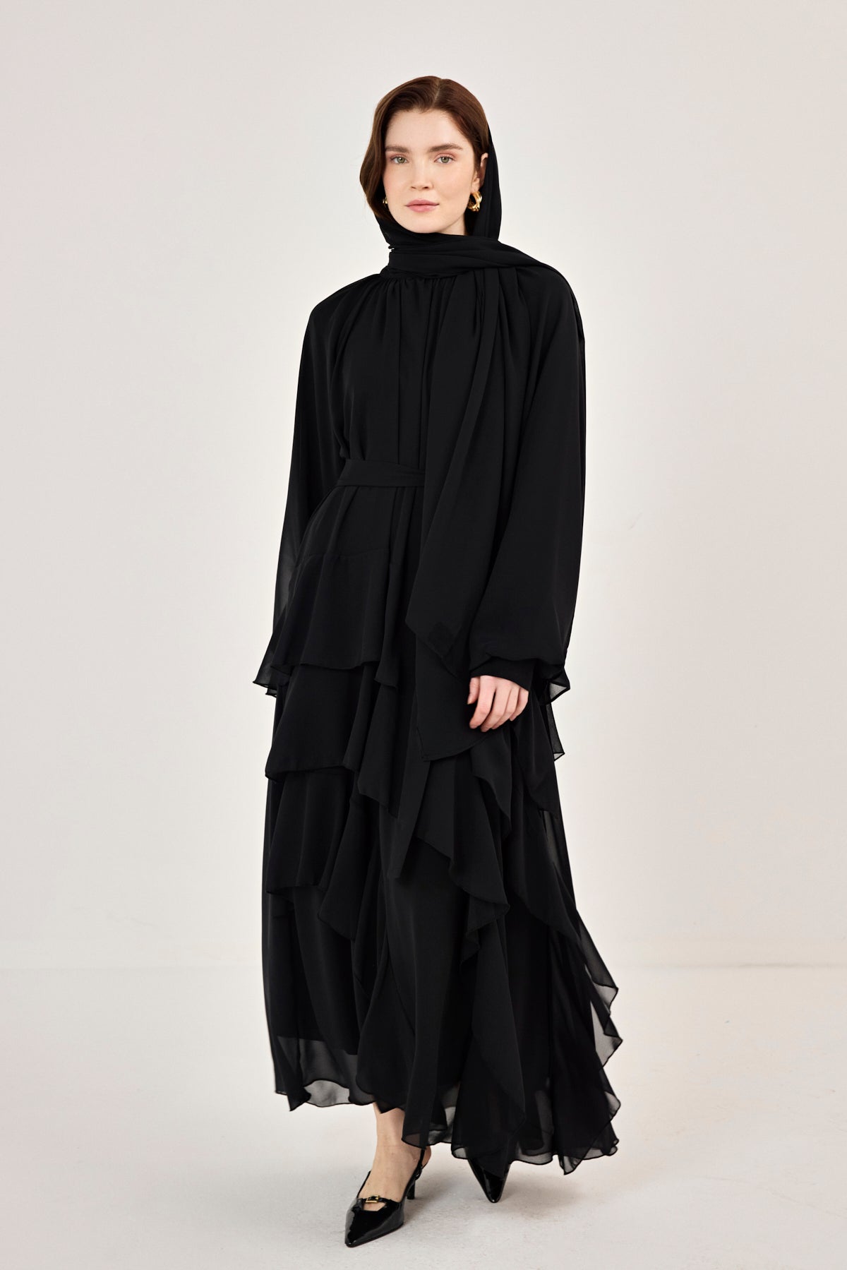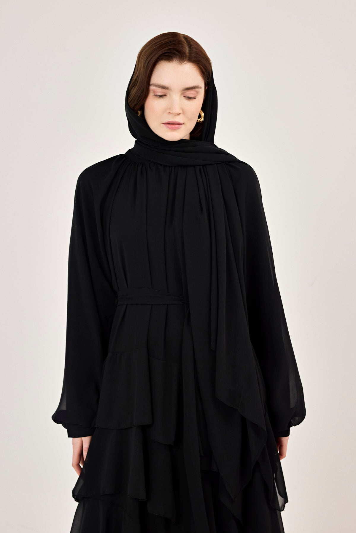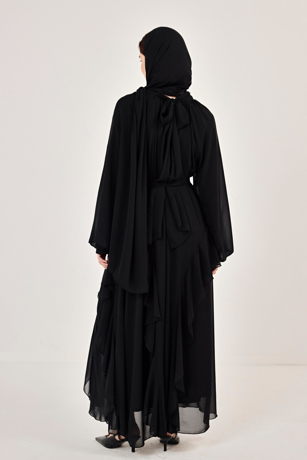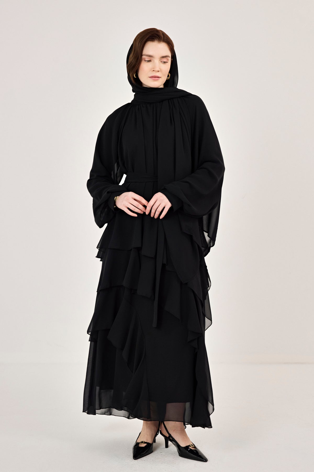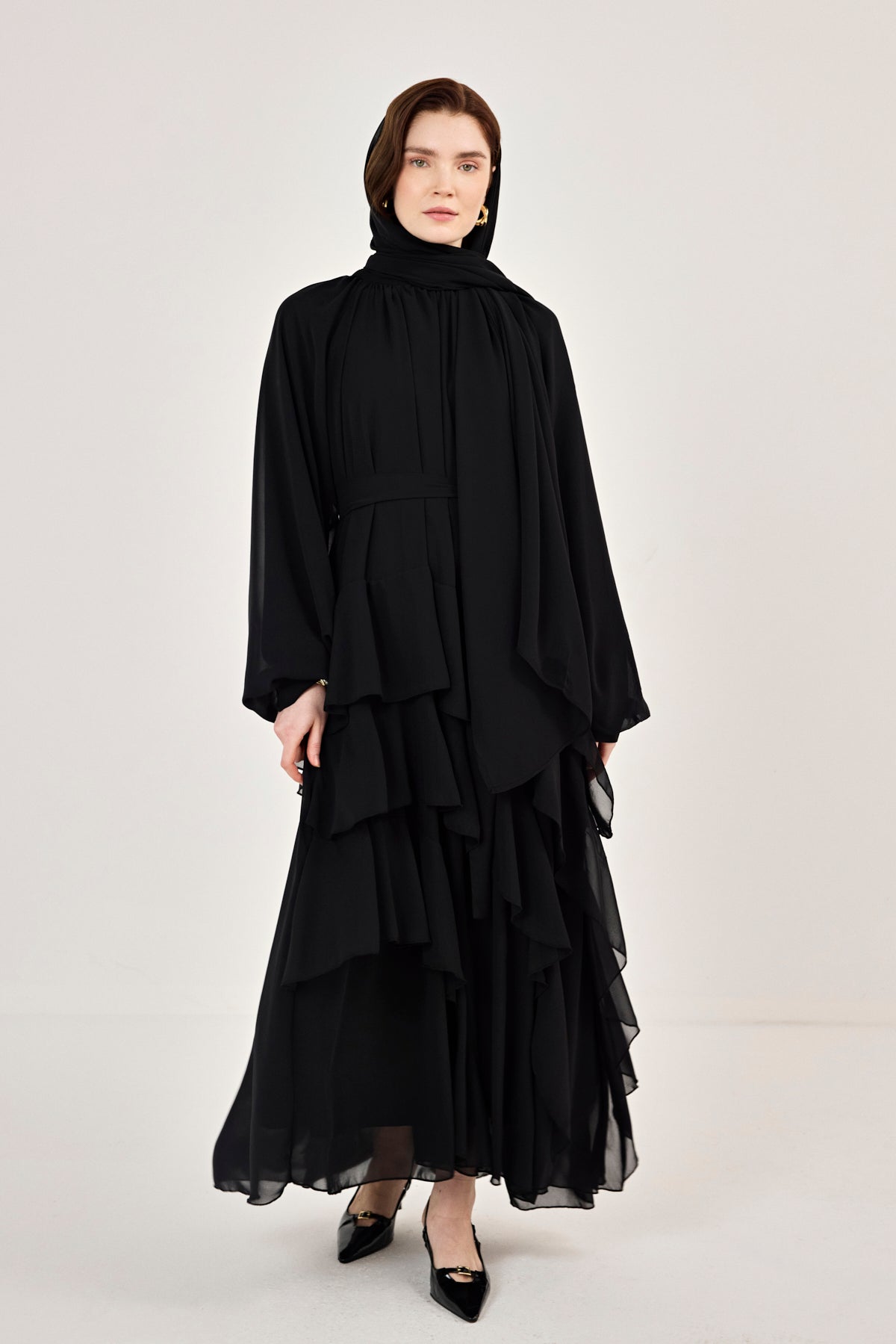 Reglan Kollu Eteği Kat Volanlı Şifon Elbise Siyah