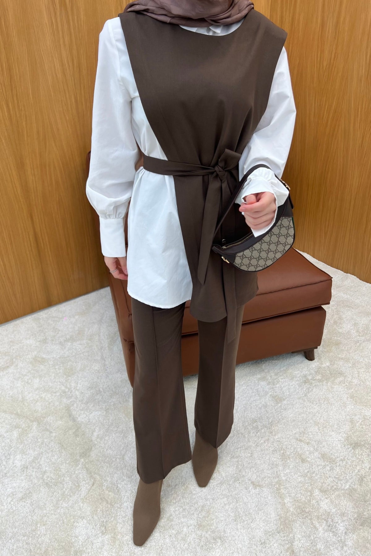 Çiçek Detaylı Yelekli İkili  Takım - Bej