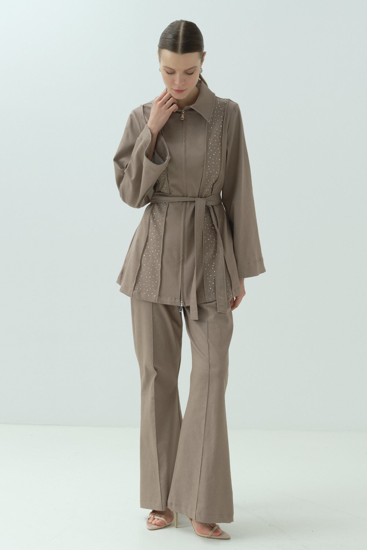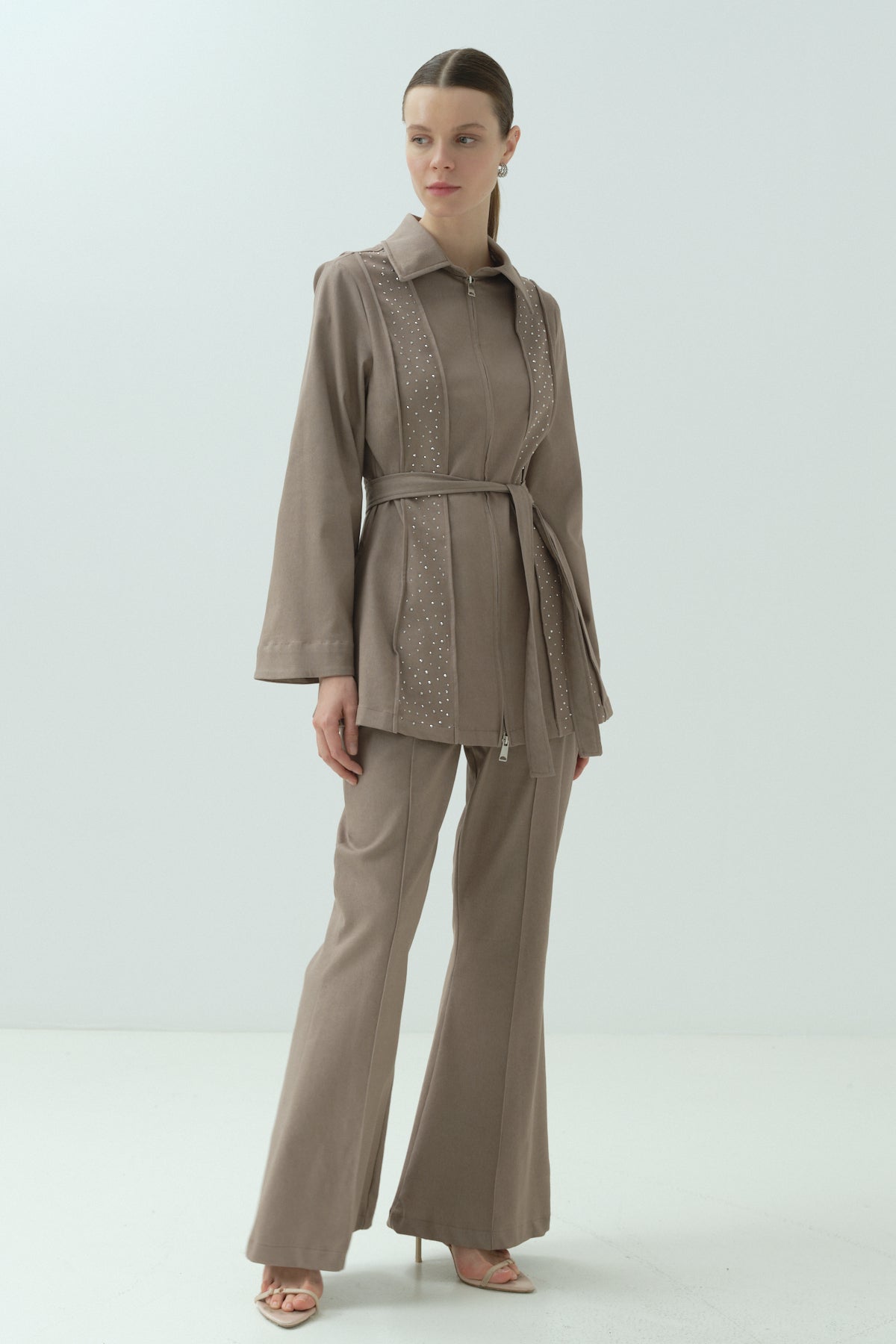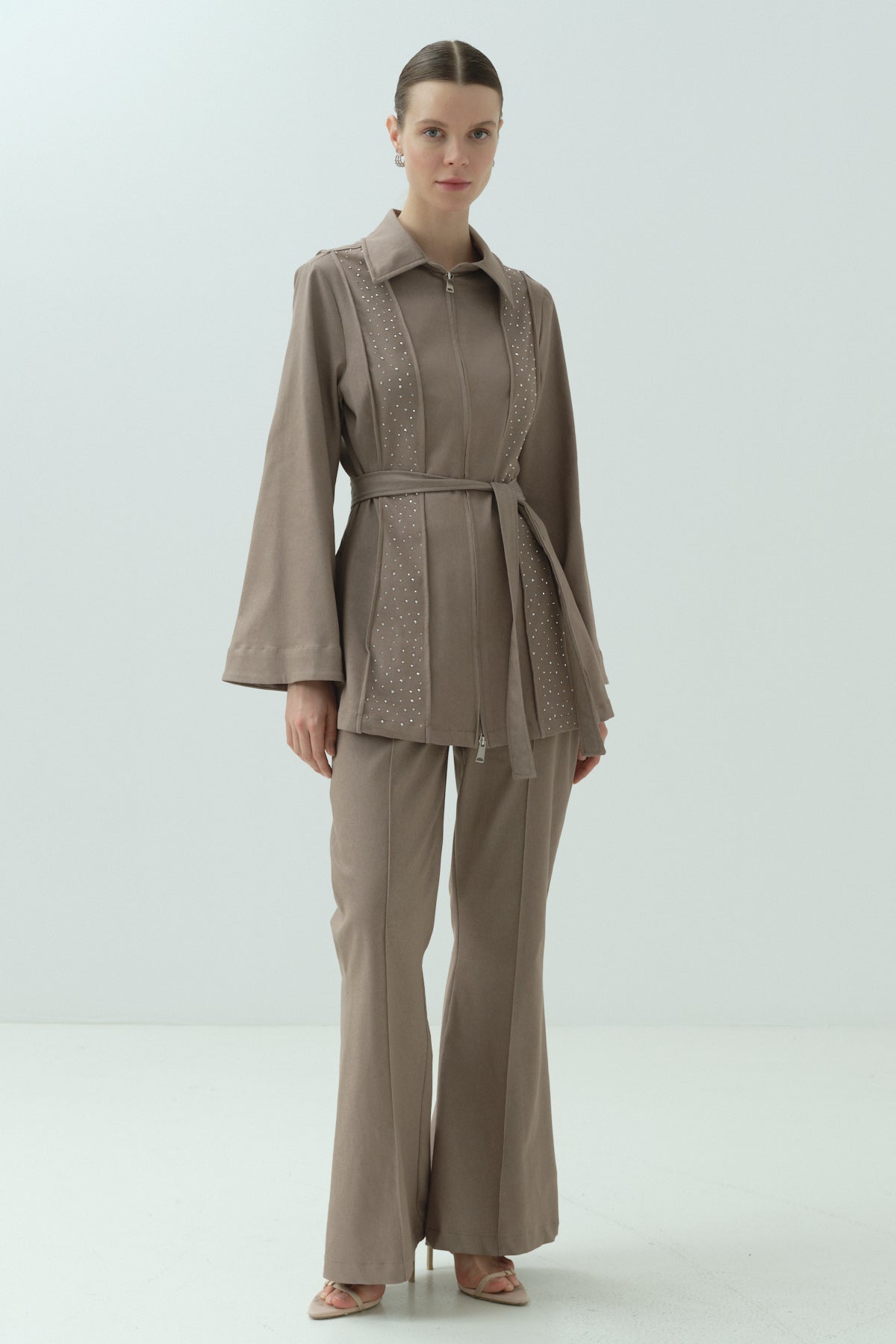 Taş Detaylı Fermuarlı Pantolonlu Takım Vizon