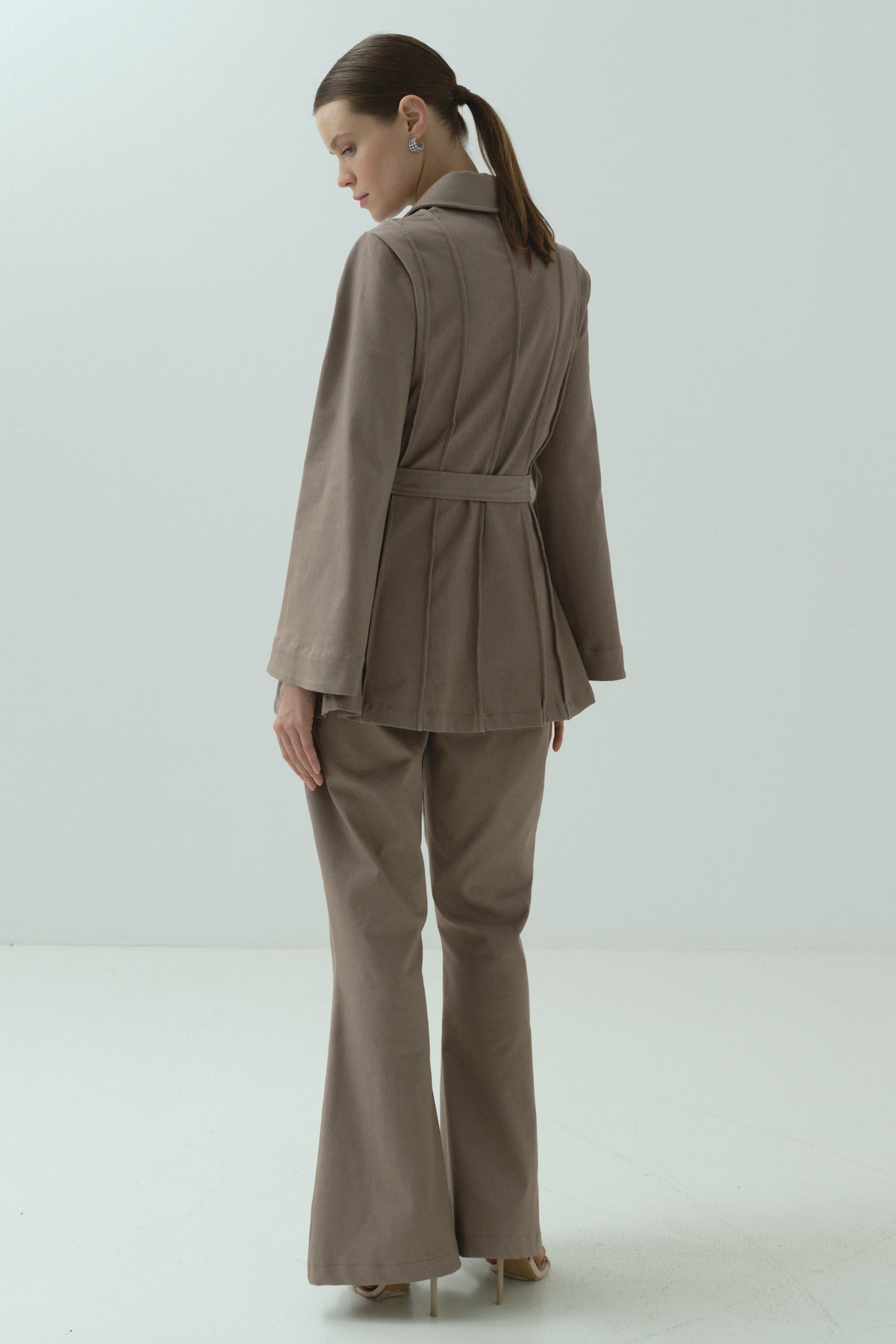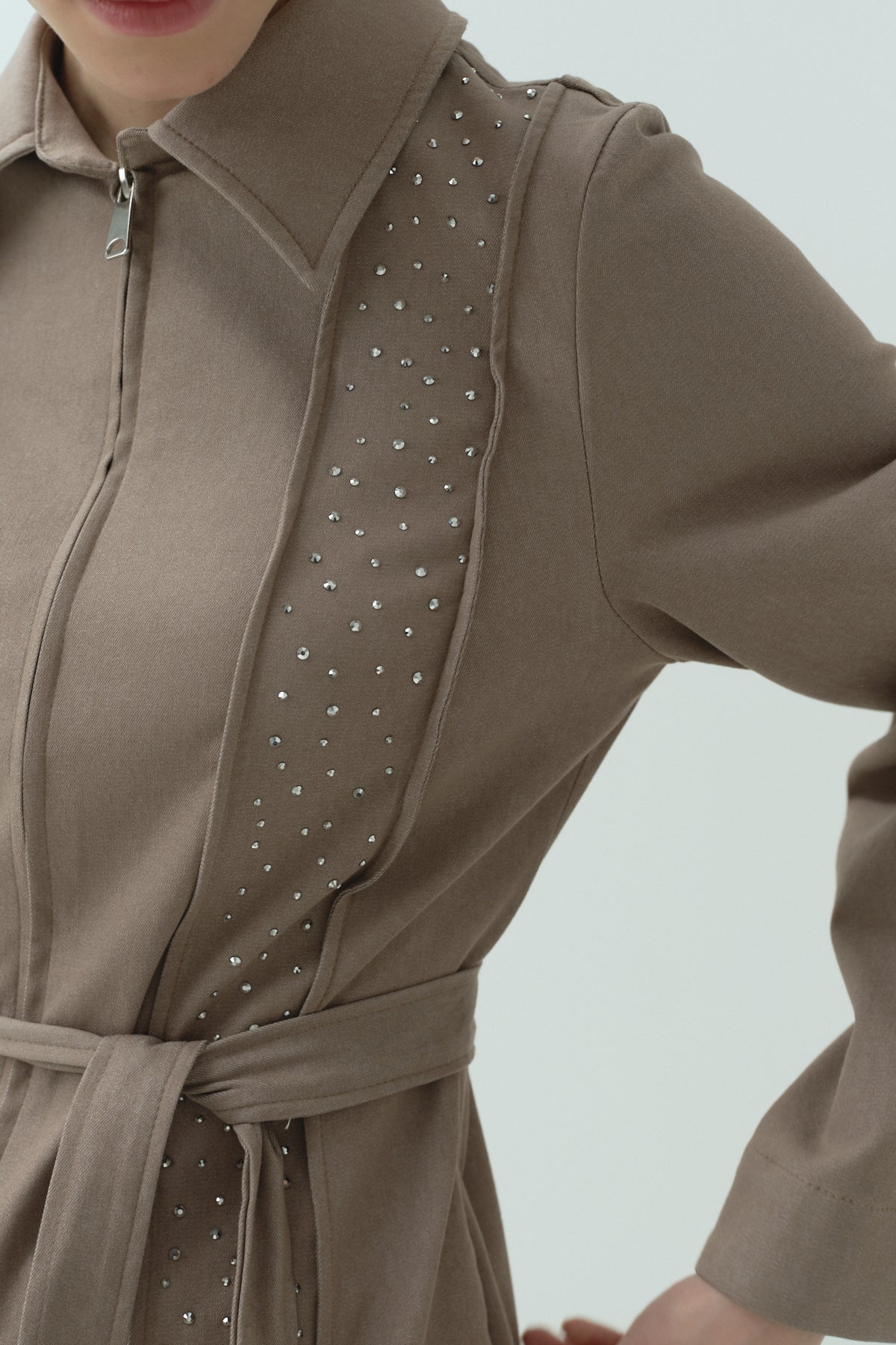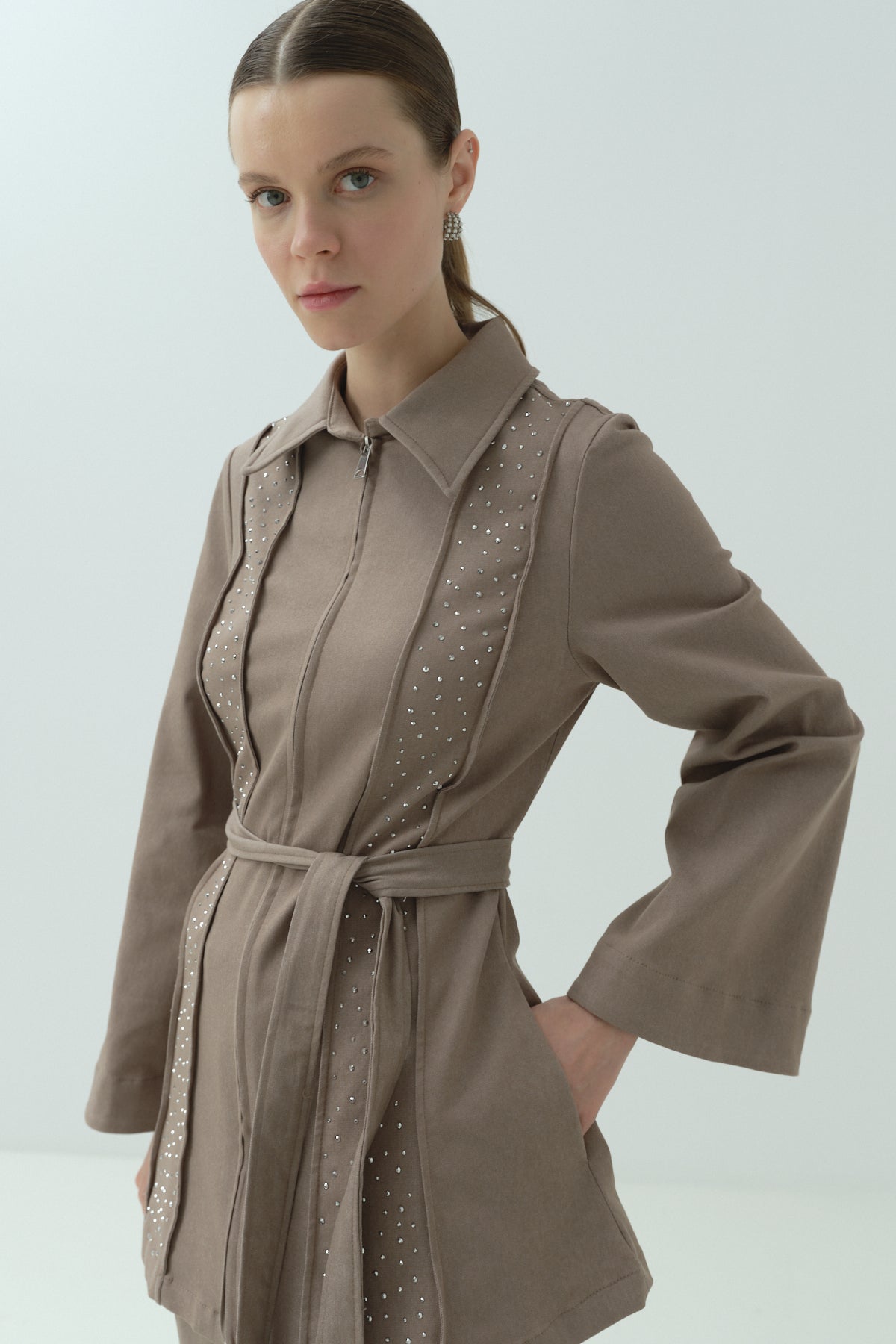 Taş Detaylı Fermuarlı Pantolonlu Takım Vizon