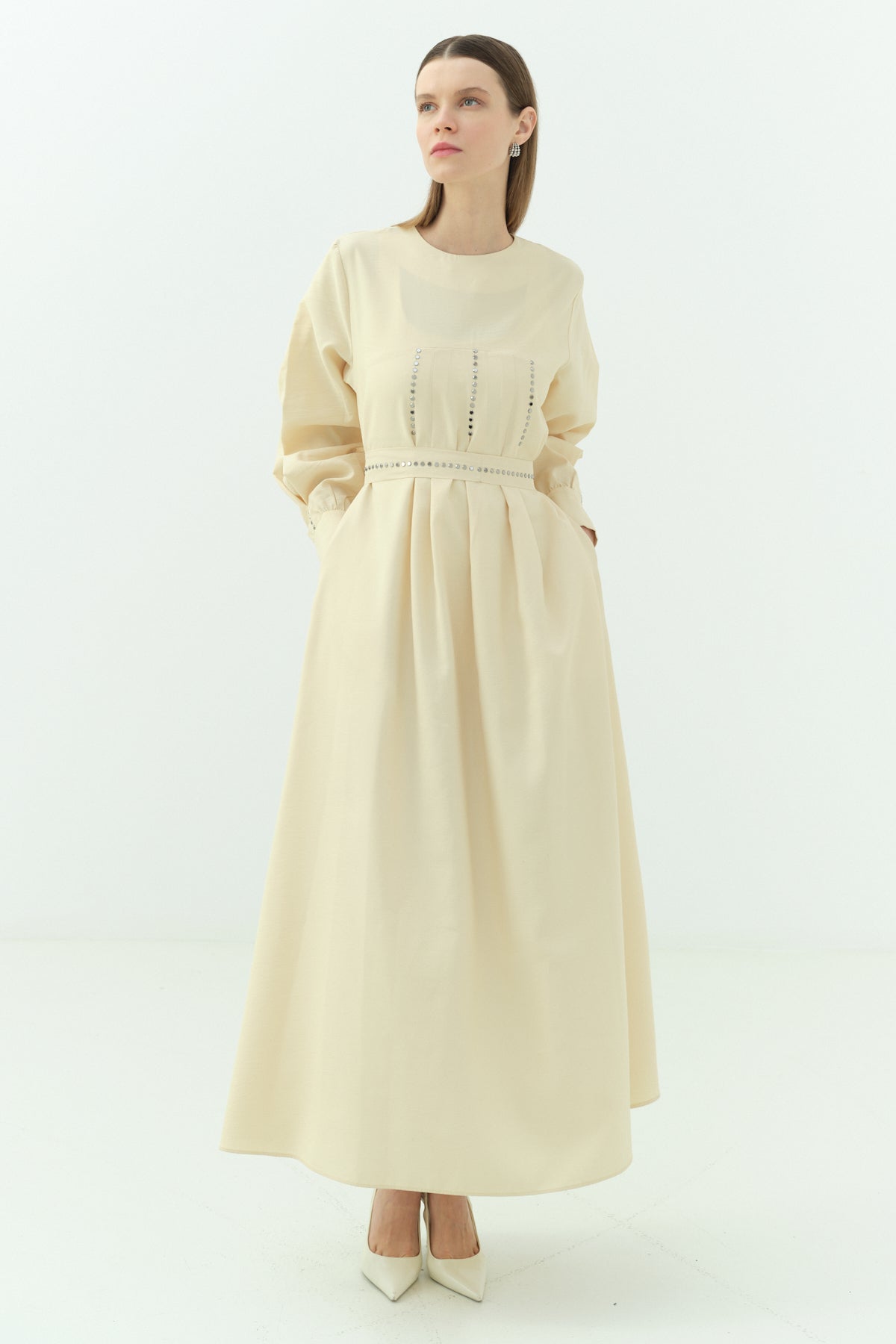 Simli Şifon Elbise - Bej