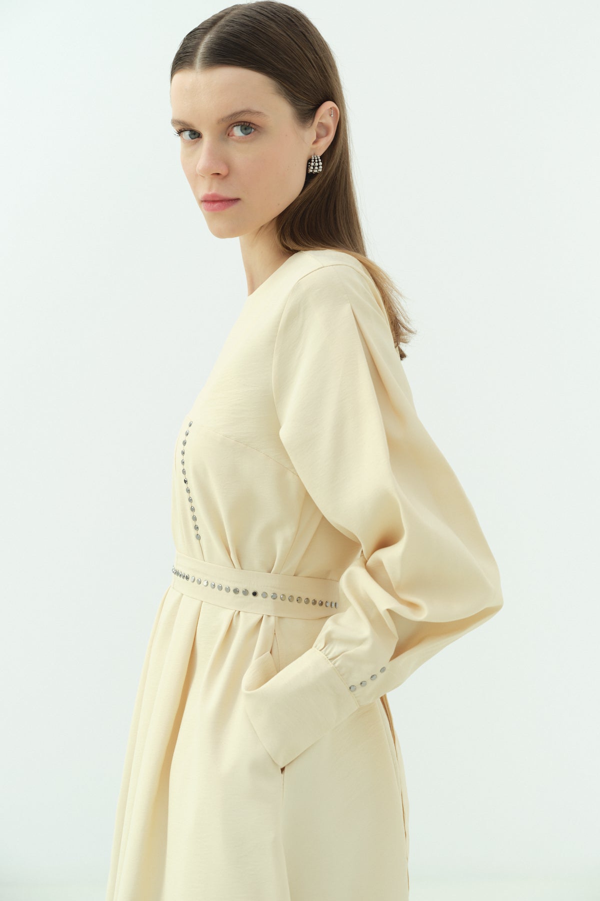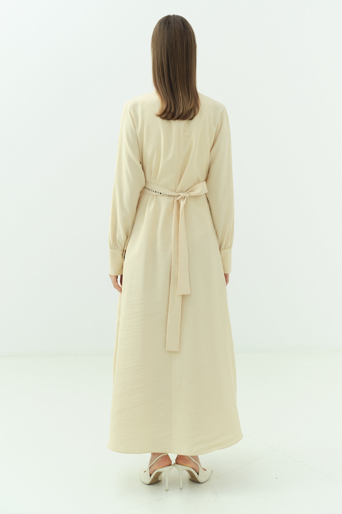 Yaka Detaylı Kuşaklı Elbise - Bej