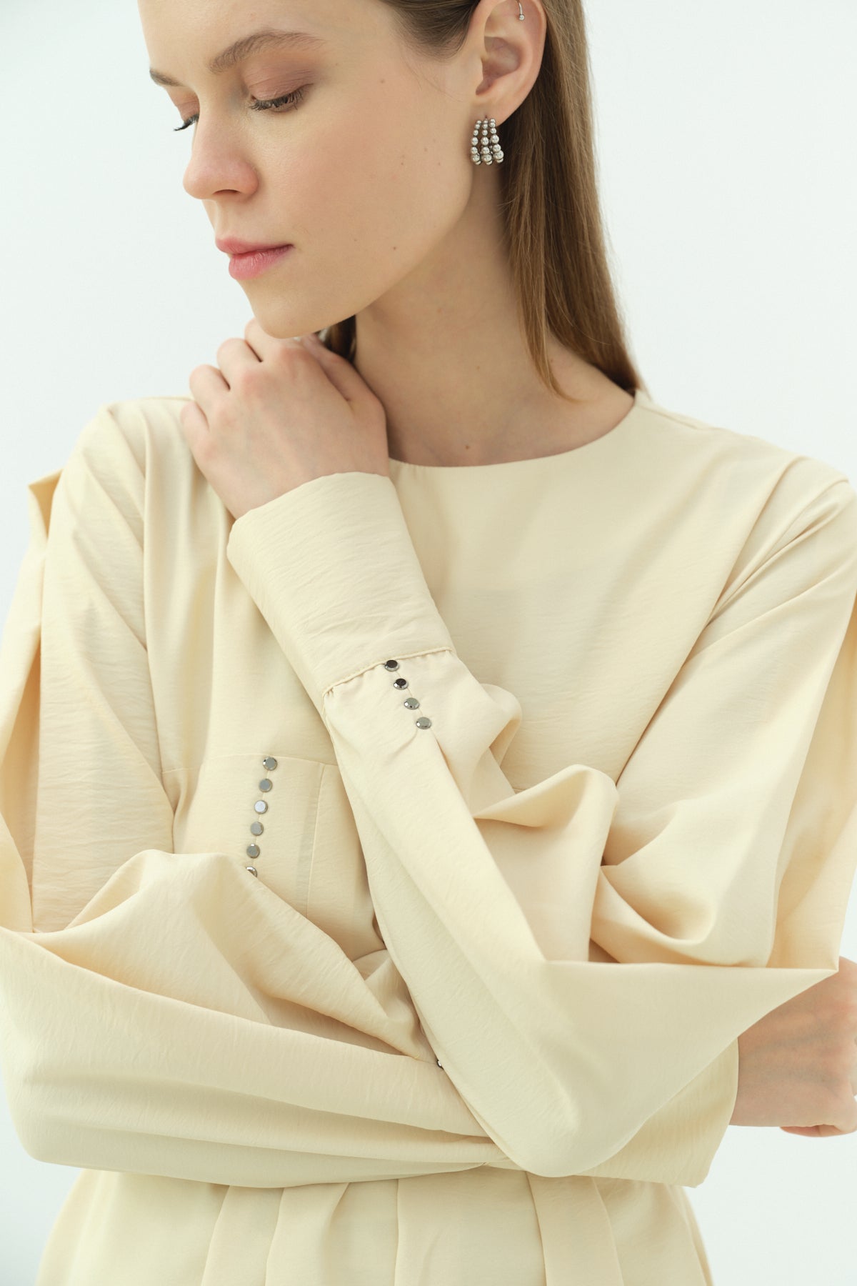 Düğmeli Güpür Detaylı İkili Takım - Bej