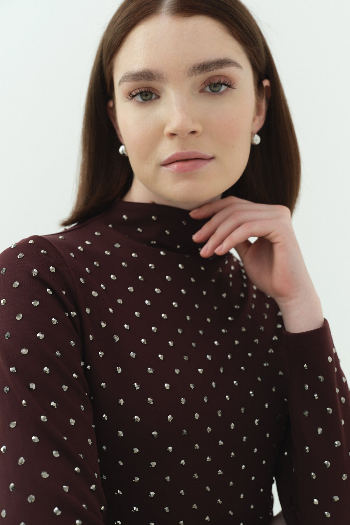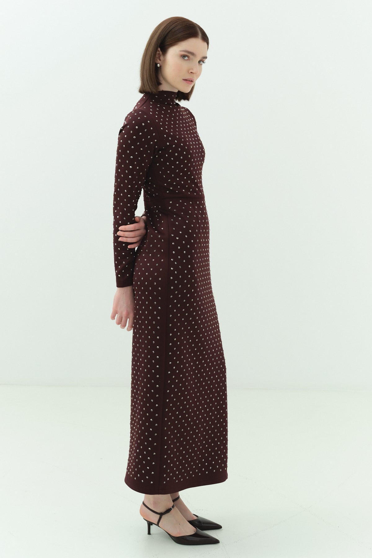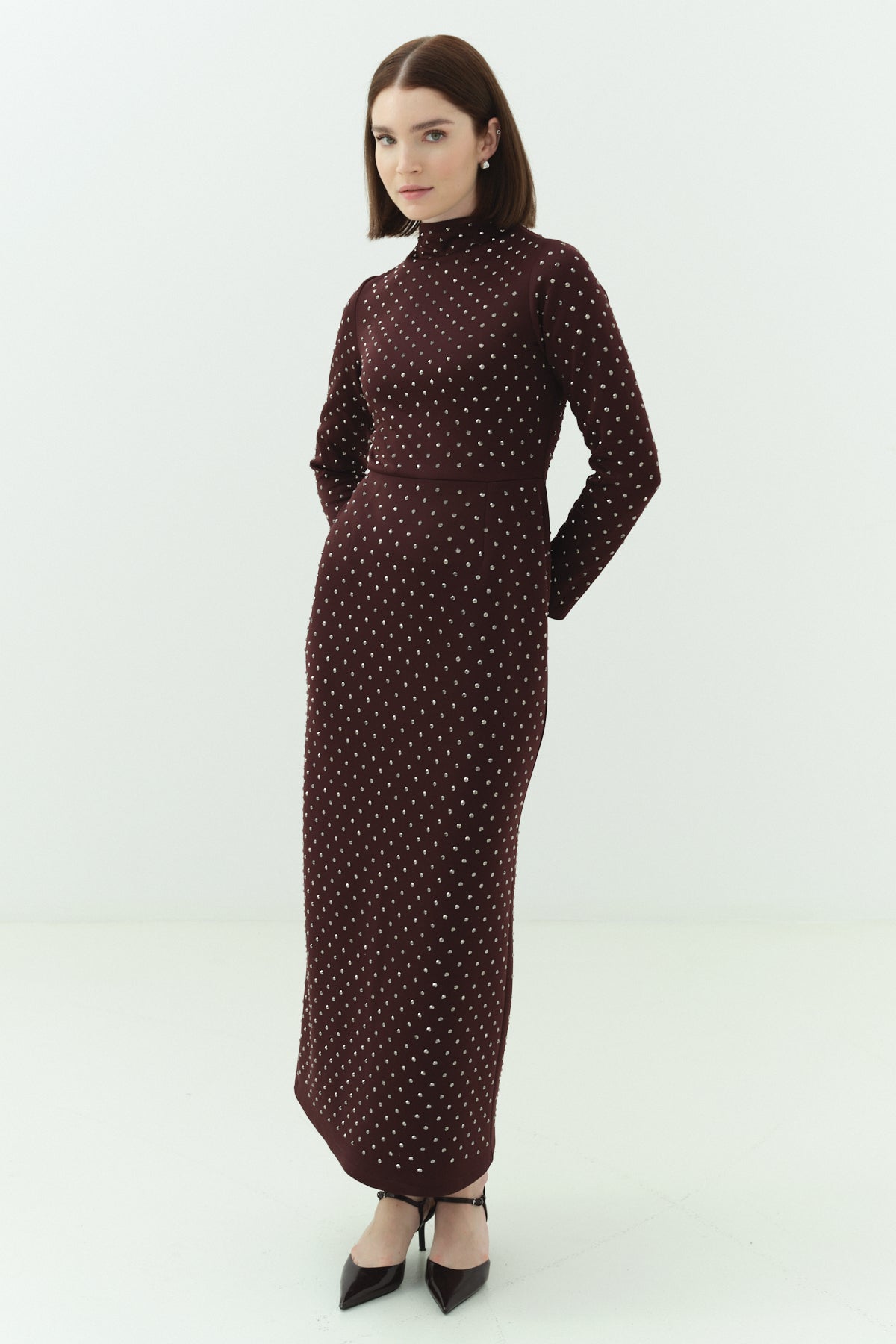 Çiçek Broşlu Simli Abiye Elbise - Bej