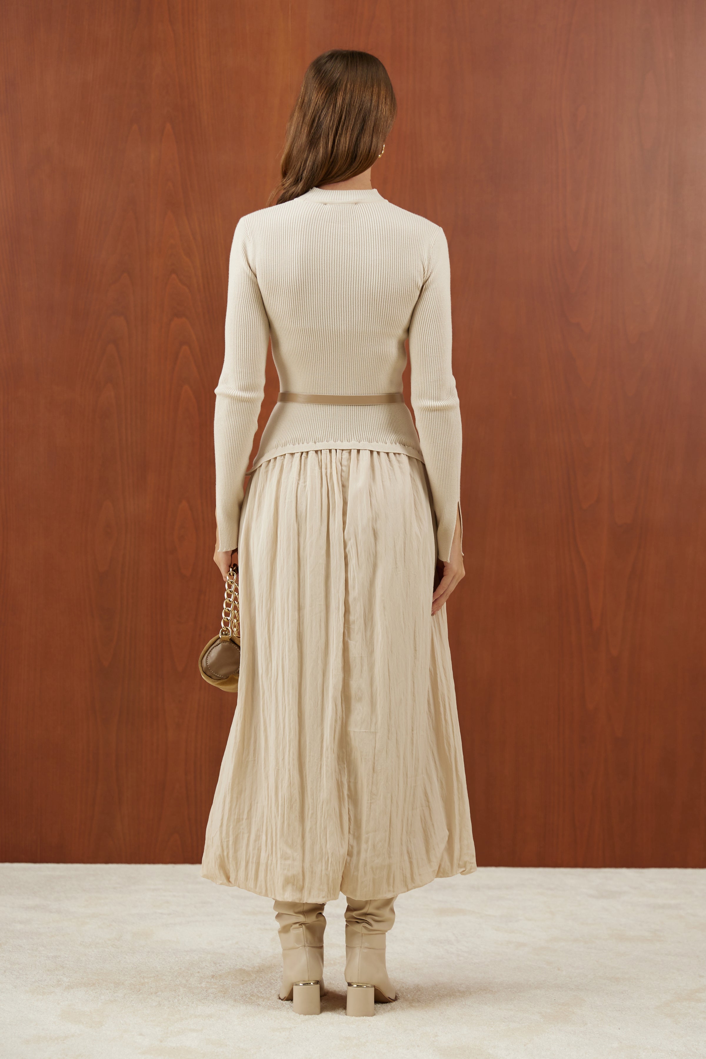 Yaka Detaylı Kuşaklı Elbise - Bej